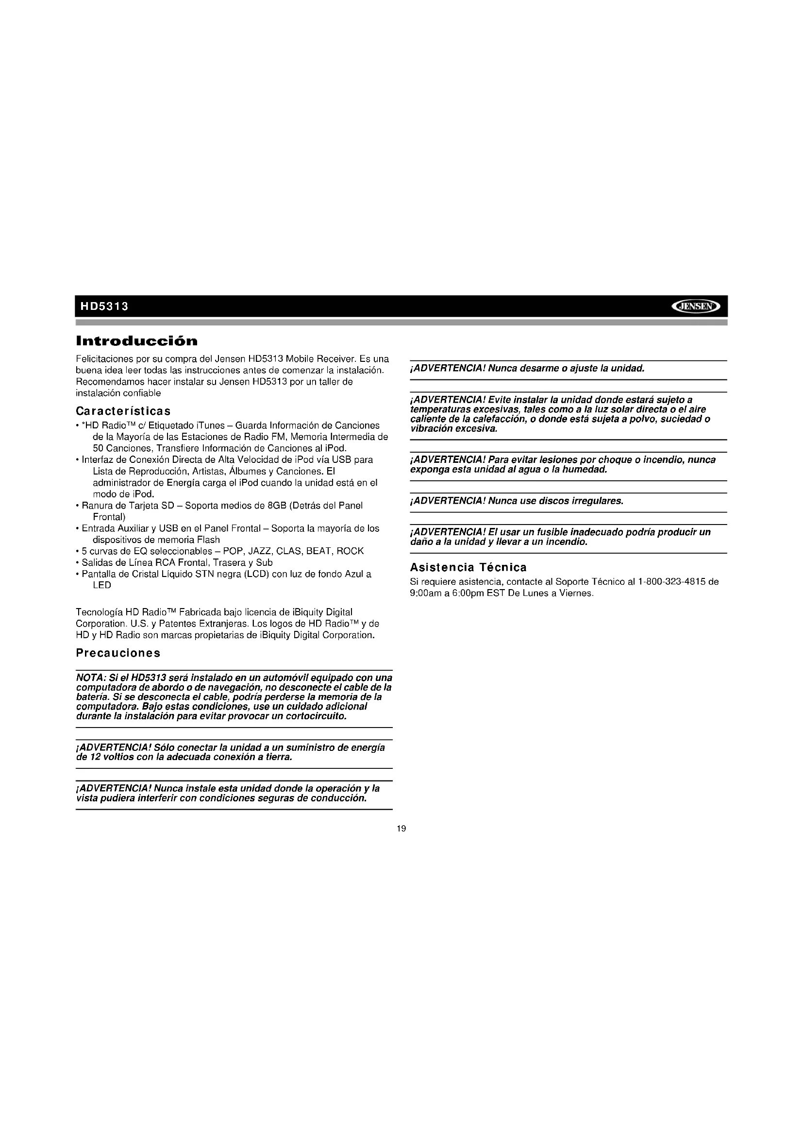 - Pantalla de Cristal Líquido STN negra (LCD) con luz de fondo Azul a LED Tecnología HD Radio™ Fabricada bajo licencia de iBiquity Digital Corporation. U.S. y Patentes Extranjeras. Los logos de HD Radio™ y de HD y HD Radio son marcas propietarias de iBiquity Digital Corporation. Precauciones NOTA: Si el HD5313 será instalado en un automóvil equipado con una computadora de abordo o de navegación, no desconecte el cable de la batería. Si se desconecta el cable, podría perderse la memoria de la computadora. Bajo estas condiciones, use un cuidado adicional durante la instalación para evitar provocar un cortocircuito. ¡ADVERTENCIA! Sólo conectar la unidad a un suministro de energía de 12 voltios con la adecuada conexión a tierra. ¡ADVERTENCIA! Nunca instale esta unidad donde la operación y la vista pudiera interferir con condiciones seguras de conducción. ¡ADVERTENCIA! Nunca desarme o ajuste la unidad. ¡ADVERTENCIA! Evite instalar la unidad donde estará sujeto a temperaturas excesivas, tales como a la luz solar directa o el aire caliente de la calefacción, o donde está sujeta a polvo, suciedad o vibración excesiva. ¡ADVERTENCIA! Para evitar lesiones por choque o incendio, nunca exponga esta unidad al agua o la humedad. ¡ADVERTENCIA! Nunca use discos irregulares. ¡ADVERTENCIA! El usar un fusible inadecuado podría producir un daño a la unidad y llevar a un incendio. Asistencia Técnica Si requiere asistencia, contacte al Soporte Técnico al 1-800-323-4815 de 9:00am a 6:00pm EST De Lunes a Viernes.20 HD5313 Liberación del Panel Frontal El botón (abrir) (9) libera el mecanismo que mantiene en panel frontal en el chasis. Remover el Panel Frontal Para remover el Panel Frontal: