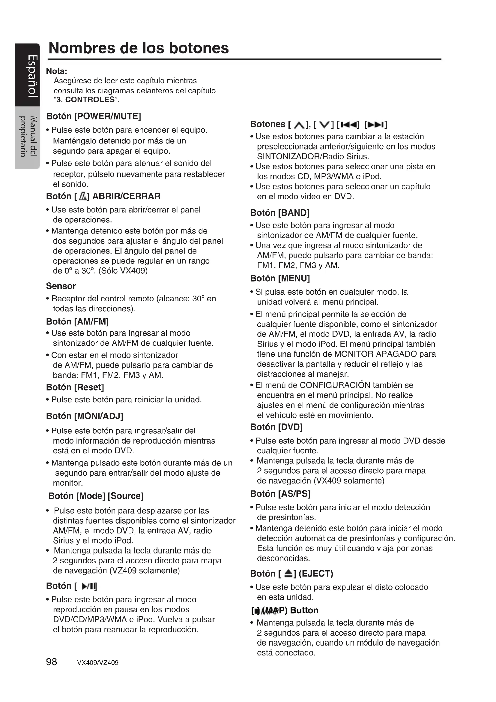 VX409/VZ409 [ ] (MAP) ButtonDescripción de la operación de botones y teclas de contacto Encendido del equipo Español Manual del propietario VX409/VZ409 PWR MUTE MENU VOL ENT MODE