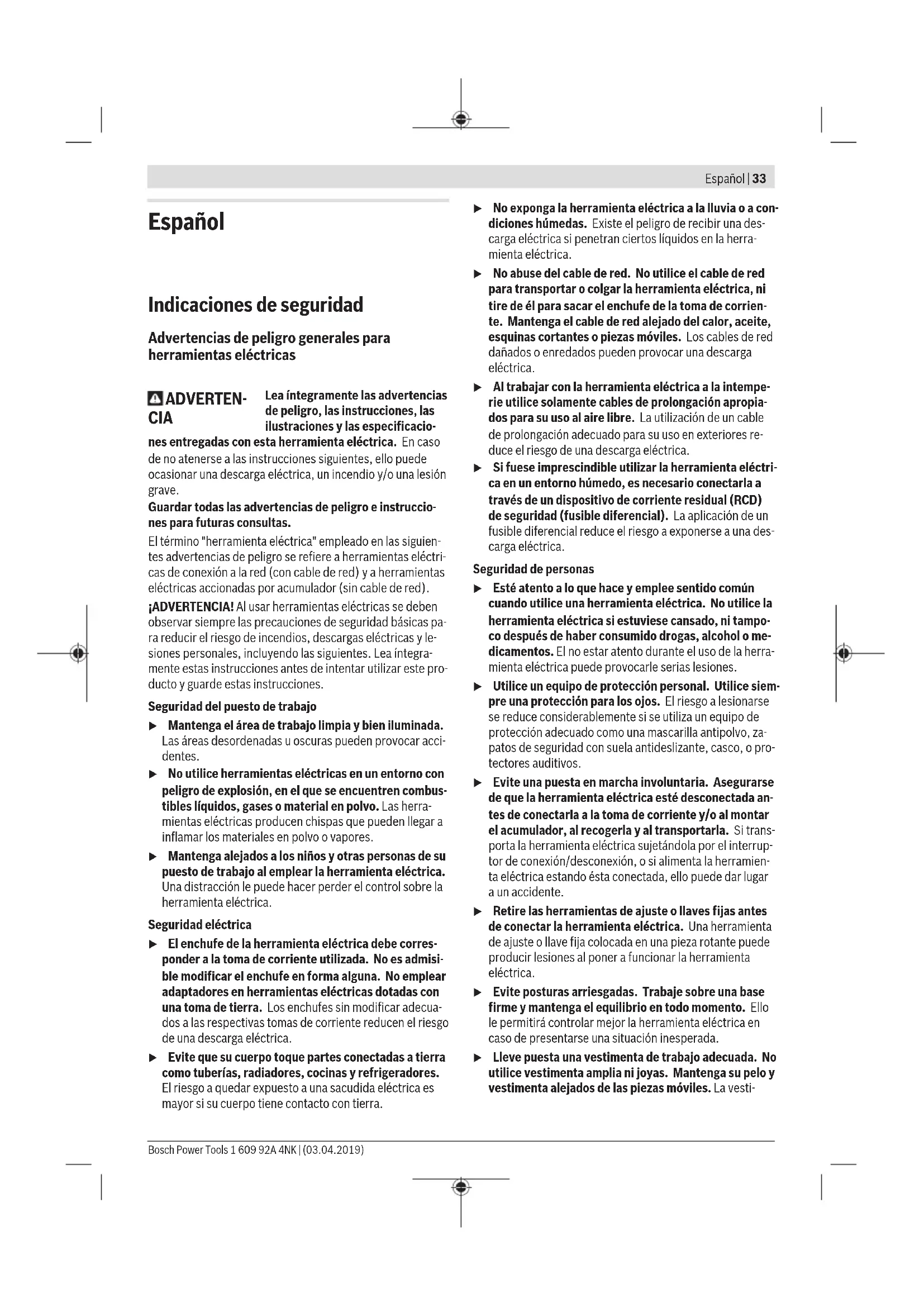 Colonne à serrage rapide 2 608 598 111 Récipient d’eau sous pression 2 609 390 308 Aspirateur eau et poussière GAS 35MAFC Aspirateur eau et poussière GAS 55MAFC Service après-vente et conseil utilisateurs Notre Service après-vente répond à vos questions concer- nant la réparation et l’entretien de votre produit et les pièces de rechange. Vous trouverez des vues éclatées et des infor- mations sur les pièces de rechange sur le site : www.bosch- pt.com L’équipe de conseil utilisateurs Bosch se tient à votre dispo- sition pour répondre à vos questions concernant nos pro- duits et leurs accessoires. Pour toute demande de renseignement ou commande de pièces de rechange, précisez impérativement la référence à 10chiffres figurant sur l’étiquette signalétique du produit. France Réparer un outil Bosch n’a jamais été aussi simple, et ce, en moins de 5 jours, grâce à SAV DIRECT, notre formulaire de retour en ligne que vous trouverez sur notre site internet www.bosch-pt.fr à la rubrique Services. Vous y trouverez également notre boutique de pièces déta- chées en ligne où vous pouvez passer directement vos com- mandes. Vous êtes un utilisateur, contactez : Le Service Clientèle Bosch Outillage Electroportatif Tel. : 0811 360122 (coût d'une communication locale) E-Mail : sav.outillage-electroportatif@fr.bosch.com Vous êtes un revendeur, contactez : Robert Bosch (France) S.A.S. Service Après-Vente Electroportatif 126, rue de Stalingrad 93705 DRANCY Cédex Tel. : (01) 43119006 E-Mail : sav-bosch.outillage@fr.bosch.com Belgique, Luxembourg Tel. : +32 2 588 0589 Fax : +32 2 588 0595 E-Mail : outillage.gereedschap@be.bosch.com Suisse Passez votre commande de pièces détachées directement en ligne sur notre site www.bosch-pt.com/ch/fr. Tel. : (044) 8471512 Fax : (044) 8471552 E-Mail : Aftersales.Service@de.bosch.com Élimination des déchets L’outil électroportatif, le support de forage, les accessoires et les emballages doivent être rapportés à un centre de recy- clage respectueux de l’environnement. Ne jetez pas les outils électroportatifs avec les ordures ménagères! Seulement pour les pays de l’UE : Conformément à la directive européenne 2012/19/UE rela- tive aux déchets d’équipements électriques et électroniques et sa mise en vigueur conformément aux législations natio- nales, les outils électroportatifs dont on ne peut plus se ser- vir doivent être isolés et suivre une voie de recyclage appro- priée. 1 609 92A 4NK | (03.04.2019) Bosch Power ToolsEspañol | 33 Español Indicaciones de seguridad Advertencias de peligro generales para herramientas eléctricas ADVERTEN- CIA Lea íntegramente las advertencias de peligro, las instrucciones, las ilustraciones y las especificacio- nes entregadas con esta herramienta eléctrica. En caso de no atenerse a las instrucciones siguientes, ello puede ocasionar una descarga eléctrica, un incendio y/o una lesión grave. Guardar todas las advertencias de peligro e instruccio- nes para futuras consultas. El término "herramienta eléctrica" empleado en las siguien- tes advertencias de peligro se refiere a herramientas eléctri- cas de conexión a la red (con cable de red) y a herramientas eléctricas accionadas por acumulador (sin cable de red). ¡ADVERTENCIA! Al usar herramientas eléctricas se deben observar siempre las precauciones de seguridad básicas pa- ra reducir el riesgo de incendios, descargas eléctricas y le- siones personales, incluyendo las siguientes. Lea íntegra- mente estas instrucciones antes de intentar utilizar este pro- ducto y guarde estas instrucciones. Seguridad del puesto de trabajo u Mantenga el área de trabajo limpia y bien iluminada. Las áreas desordenadas u oscuras pueden provocar acci- dentes. u No utilice herramientas eléctricas en un entorno con peligro de explosión, en el que se encuentren combus- tibles líquidos, gases o material en polvo. Las herra- mientas eléctricas producen chispas que pueden llegar a inflamar los materiales en polvo o vapores. u Mantenga alejados a los niños y otras personas de su puesto de trabajo al emplear la herramienta eléctrica. Una distracción le puede hacer perder el control sobre la herramienta eléctrica. Seguridad eléctrica u El enchufe de la herramienta eléctrica debe corres- ponder a la toma de corriente utilizada. No es admisi- ble modificar el enchufe en forma alguna. No emplear adaptadores en herramientas eléctricas dotadas con una toma de tierra. Los enchufes sin modificar adecua- dos a las respectivas tomas de corriente reducen el riesgo de una descarga eléctrica. u Evite que su cuerpo toque partes conectadas a tierra como tuberías, radiadores, cocinas y refrigeradores. El riesgo a quedar expuesto a una sacudida eléctrica es mayor si su cuerpo tiene contacto con tierra. u No exponga la herramienta eléctrica a la lluvia o a con- diciones húmedas. Existe el peligro de recibir una des- carga eléctrica si penetran ciertos líquidos en la herra- mienta eléctrica. u No abuse del cable de red. No utilice el cable de red para transportar o colgar la herramienta eléctrica, ni tire de él para sacar el enchufe de la toma de corrien- te. Mantenga el cable de red alejado del calor, aceite, esquinas cortantes o piezas móviles. Los cables de red dañados o enredados pueden provocar una descarga eléctrica. u Al trabajar con la herramienta eléctrica a la intempe- rie utilice solamente cables de prolongación apropia- dos para su uso al aire libre. La utilización de un cable de prolongación adecuado para su uso en exteriores re- duce el riesgo de una descarga eléctrica. u Si fuese imprescindible utilizar la herramienta eléctri- ca en un entorno húmedo, es necesario conectarla a través de un dispositivo de corriente residual (RCD) de seguridad (fusible diferencial). La aplicación de un fusible diferencial reduce el riesgo a exponerse a una des- carga eléctrica. Seguridad de personas u Esté atento a lo que