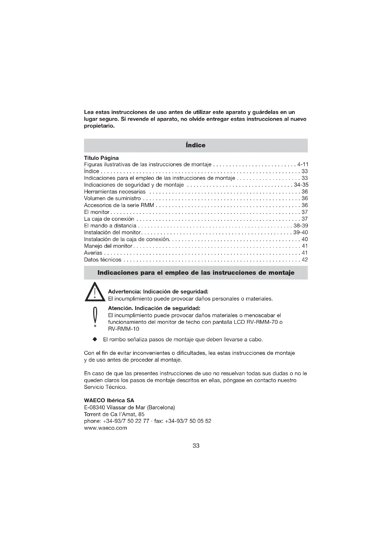 - Instalación del monitor Indicaciones generales de montaje Antes de proceder al montaje del monitor, tenga en cuenta lo siguiente: – Coloque el monitor en un lugar escogido a modo de prueba. – El monitor debe montarse sobre una superficie nivelada. – Antes de proceder al montaje definitivo, compruebe si se dispone del espacio necesario en la parte superior del lugar de montaje seleccionado para colocar las arandelas y las tuercas. –Tenga en cuenta el peso del monitor. ¿Se precisan refuerzos (arandelas o placas más grandes)? – ¿Es posible tender los cables de conexión y de prolongación hasta el monitor? – El monitor no debe colocarse en las proximidades del campo de actuación de un AIR BAG. El viajero podría resultar herido al dispararse el airbag. No monte el monitor a la altura de la cabeza.Instalación del monitor Efectúe una prueba de funcionamiento antes del montaje. Si el vehículo tuviera una iluminación del habitáculo instalada en un lugar adecuado, p. ej., entre el asiento del conductor y el del acompañante, se podría instalar en ese lugar el monitor de techo. Compruebe si la longitud del cable de conexión alcanza desde el lugar de montaje hasta la caja de conexión. Atención: asegúrese de que el monitor se puede fijar en el lugar de montaje de manera segura (véase H 1.4). ¿Es el recubrimiento del techo lo suficientemente estable? ¿Es posible efectuar una fijación segura y suficiente con los tornillos (véase H 1.5)? Compruebe si se puede abrir el monitor (véase H 1.5). Atención: la luz ambiental debe estar desconectada de la corriente para evitar que durante la instalación del monitor se puedan producir cortocircuitos, etc. Retire la luz ambiental (véase H 1.1). Monte la placa de montaje (véase H 1.2). Tienda el cable de conexión desde el monitor hasta el lugar previsto para la instalación de la caja de conexión. Conecte el cable de alimentación de la luz ambiental original a los conectores del monitor (no es necesario tener en cuenta la polaridad) (véase H 1.3). Enchufe el cable de conexión en la hembrilla (véase H 1.6). Respete sin falta las indicaciones de seguridad. Instalación de la caja de conexión El lugar de montaje debe estar protegido contra la humedad. Debido al diseño compacto, resulta recomendable efectuar el montaje debajo del tablero de instrumentos. La caja se puede fijar por medio de los tornillos de rosca cortante incluidos en el suministro o por medio de cinta de velcro autoadhesiva (no incluida en el suministro). Por favor, respete las indicaciones de seguridad y de montaje. La alimentación de tensión debería llevarse a cabo a través de una fuente de tensión conectada como, p. ej., el borne 15. Incluso cuando está desconectado (recepción de infrarrojos activada), el sistema presenta cierto consumo de potencia que, durante un periodo prolongado, es capaz de descargar la batería del vehículo. La caja de conexión ofrece entradas para 2 fuentes de vídeo (véase I 2). Puede tratarse de un reproductor de DVD (referencia WAECO DVD-PL-10), una cámara, etc. Introduzca los cables RCA de las fuentes de vídeo en las hembrillas VIDEO/AUDIO (véase I 2). Si sólo se emplea una entrada de audio, se genera una señal de audio mono. 40Manejo del monitor Una vez se haya completado la conexión, el monitor se enciende automáticamente tan pronto como se registre tensión de suministro (POWER DIRECT = ON);también es posible encender el aparato a través del mando a distancia (tecla POWER) (véase F 1.1). Si hay conectada una fuente de vídeo y está en uso, aparece la imagen y la señal se emite bien a través del auricular por infrarrojos que se suministra como accesorio HS-10 (véase G 1), o bien a través de la radio del vehículo (si se emplea el FM-MOD-10). Para cambiar el canal de vídeo, pulse la tecla AV (véase F 1.7) del mando a distancia. Si desea modificar los ajustes, puede hacerlo a través de las teclas MODE y VOL situadas en el monitor (véase D 1.5/1.6/1.7) o del mando a distancia (véase F 1.5/1.4). El monitor se puede girar hacia ambos lados y hacia atrás unos 15° (véanse G 1 y 2). Uso del auricular HS-10 Los monitores RV-RMM-70 y 104 están dotados de un emisor de infrarrojos. Dicho emi- sor permite utilizar el auricular inalámbrico por infrarrojos HS-10 (consulte las instruccio- nes del mismo si desea información más detallada). Si lo usa, colóquese en un campo de aprox. 120° en sentido horizontal y 60° en el vertical delante del monitor (véase G). Así, queda garantizada la recepción del sonido sin problemas. Averías La imagen tiembla La alimentación de tensión ha caído por debajo de 12 V. Cargue la batería del vehículo. Asegúrese de que el cable de conexión entre la fuente de tensión y la caja de conexión sea lo más corto posible. Secuencia de imágenes demasiado rápida El formato de video ajustado (COLOR SYSTEM) no es el adecuado para la fuente de vídeo. Modifique el formato, p. Ej., de NTSC a PAL. 41Datos técnicos Medidas (AxHxP): 210 x 230 x 40 mm (RV-RMM-70) Medidas (AxHxP): 285 x 310 x 40 mm (RV-RMM-104) Tensión de servicio: 12 V CC, máx. 15 V Consumo de corriente: máx. 16 Vatios incl. luz ambiental (RV-RMM-70) 18 Vatios incl. luz ambiental (RV-RMM-104) Tamaño de la imagen: 7”, 17,7 cm diagonal (RV-RMM-70) Tamaño de la imagen: 10,4”, 26,4 cm diagonal (RV-RMM-104) Píxeles: 337.000 píxeles (RV-RMM-70) Píxeles: 480.000 píxeles (RV-RMM-104) Sistema de vídeo: NTSC/PAL Temperatura de servicio: de 0 °C a +60 °C Peso: aprox. 1,5 kg (RV-RMM-70) Peso: aprox. 2,5 kg (RV-RMM-104) Queda reservado el derecho a efectuar actualizaciones técnicas. Conserve estas instrucciones de uso y entrégueselas, en caso de venta del aparato, al nuevo propietario. Si desea consultar cualquier duda que pudiera surgirle acerca del RV-RMM-70 o el RV-RMM-104, póngase en contacto con: WAECO Ibérica SA E-08340 Vilassar de Mar (Barcelona) Torrent de Ca I’Amat, 85 phone: +34-93/7 50