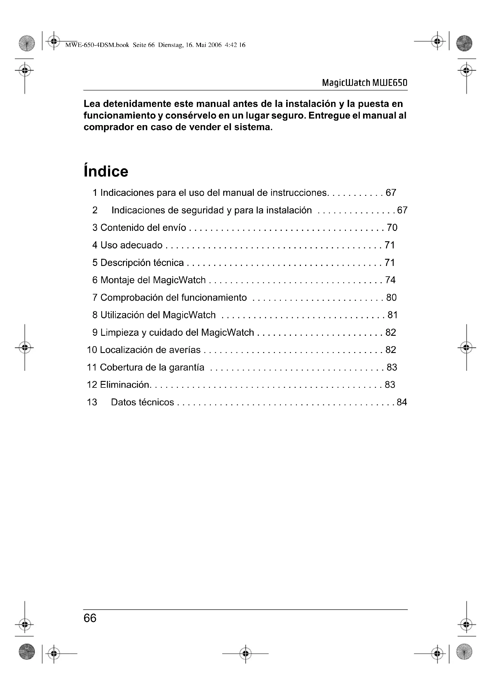 - 13 Datos técnicos MWE-650-4DSM.book Seite 66 Dienstag, 16. Mai 2006 4:42 16MagicWatch MWE650 Indicaciones para el uso del manual de instrucciones p. 84