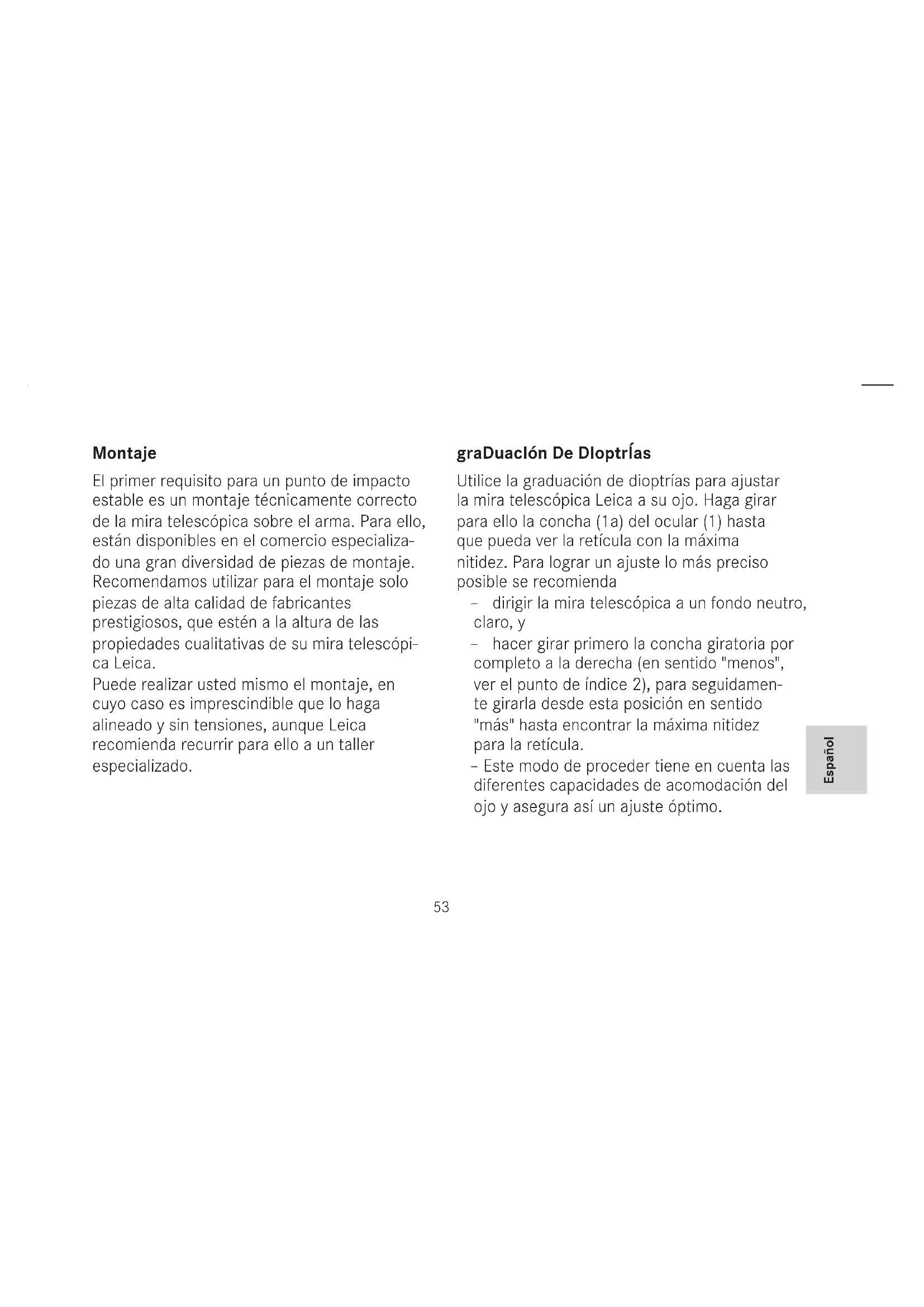 Montaje El primer requisito para un punto de impacto estable es un montaje técnicamente correcto de la mira telescópica sobre el arma. Para ello, están disponibles en el comercio especializa- do una gran diversidad de piezas de montaje. Recomendamos utilizar para el montaje solo piezas de alta calidad de fabricantes prestigiosos, que estén a la altura de las propiedades cualitativas de su mira telescópi- ca Leica. Puede realizar usted mismo el montaje, en cuyo caso es imprescindible que lo haga alineado y sin tensiones, aunque Leica recomienda recurrir para ello a un taller especializado. graDuacIón De DIoptrÍas Utilice la graduación de dioptrías para ajustar la mira telescópica Leica a su ojo. Haga girar para ello la concha (1a) del ocular (1) hasta que pueda ver la retícula con la máxima nitidez. Para lograr un ajuste lo más preciso posible se recomienda – dirigir la mira telescópica a un fondo neutro, claro, y – hacer girar primero la concha giratoria por completo a la derecha (en sentido "menos", ver el punto de índice 2), para seguidamen- te girarla desde esta posición en sentido "más" hasta encontrar la máxima nitidez para la retícula. – Este modo de proceder tiene en cuenta las diferentes capacidades de acomodación del ojo y asegura así un ajuste óptimo.ajuste De altura y lateral En caso de desviaciones del punto de impacto es preciso un ajuste de la retícula para el arma. Esto se realiza en las dos torres de ajuste - 5 para la altura, 6 para el ajuste lateral, y de la misma manera para ambos. Lo primero que debe hacer es desenroscar la cubierta de protección (5.a/6.a) en sentido contrario al de las agujas del reloj. Con la cubierta retirada queda visible la rueda moleteada 5.b/6.b, así como la escala 5.c/6.c y el punto de índice 5.d/6.d correspondientes. Las ruedas moleteadas tienen un enclavamiento muy sensible, un clic equivale a 1cm en 100m. Así pues, si el punto de impacto está desplazado hacia arriba, es necesaria una corrección hacia abajo, para lo cual se hace girar la rueda moleteada 5.b en sentido contrario al de las agujas del reloj; para una corrección hacia arriba en caso de punto de impacto bajo, se hace girar en el sentido de las agujas del reloj. Para correcciones laterales se procede de modo análogo: Si el punto de impacto está a la derecha, es necesaria una corrección hacia la izquierda, para lo cual se hace girar la rueda moleteada 6.b en sentido contrario al de las agujas del reloj; para una corrección hacia la derecha en caso de punto de impacto desplazado a la izquierda, se hace girar en el sentido de las agujas del reloj. "puesta a cero" De las escalas De las torres (el modo de proceder es el mismo para ambas torres) El proceso tiene lugar al principio como se describe en la sección anterior. Para ello