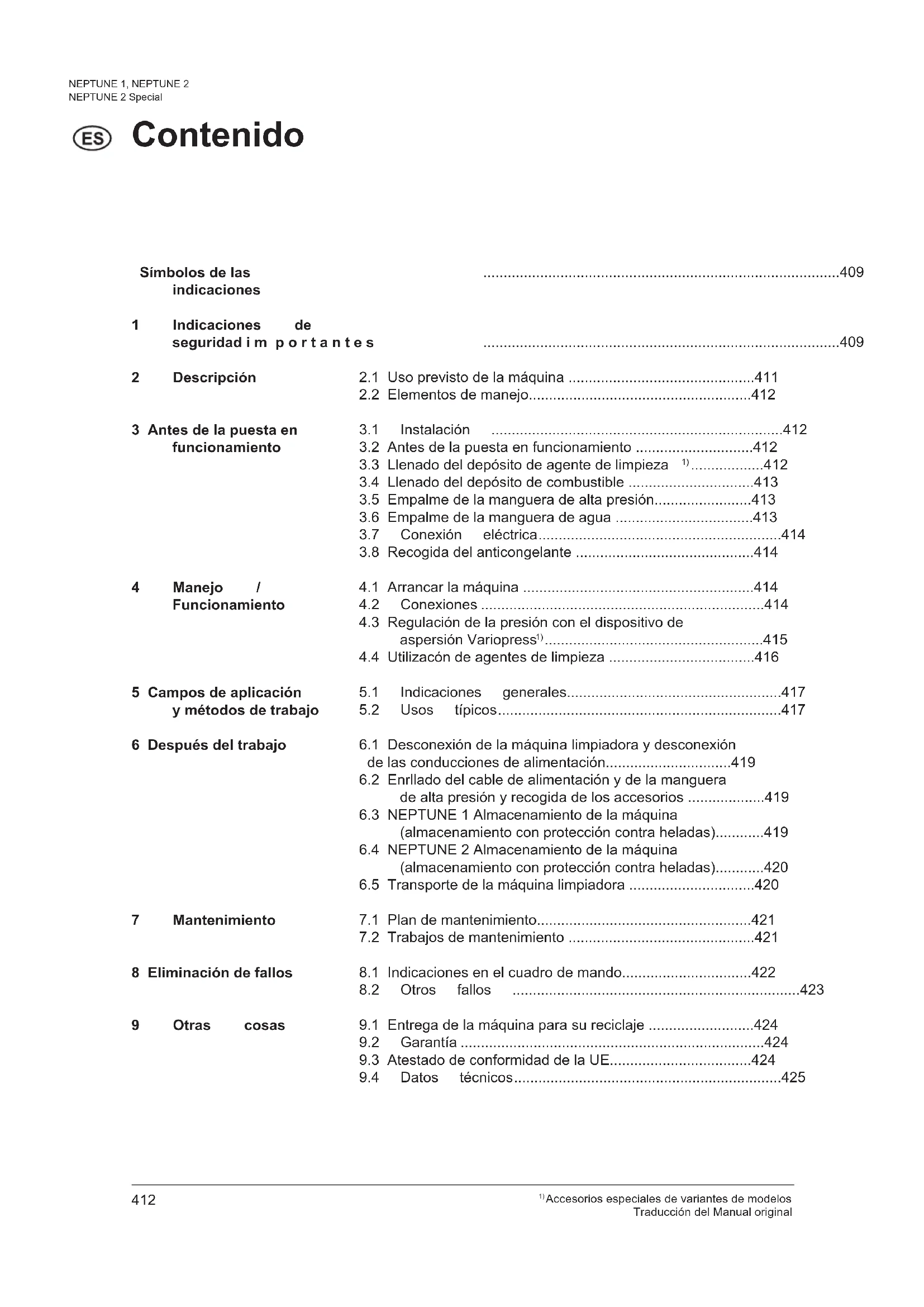 Accesorios especiales de variantes de modelos Traducción del Manual original NEPTUNE 1, NEPTUNE 2 NEPTUNE 2 Special Contenido Símbolos de las indicaciones 1 Indicaciones de seguridad i m p o r t a n t e s 2 Descripción 3 Antes de la puesta en funcionamiento 4 Manejo / Funcionamiento 5 Campos de aplicación y métodos de trabajo 6 Después del trabajo 7 Mantenimiento 8 Eliminación de fallos 9 Otras cosas