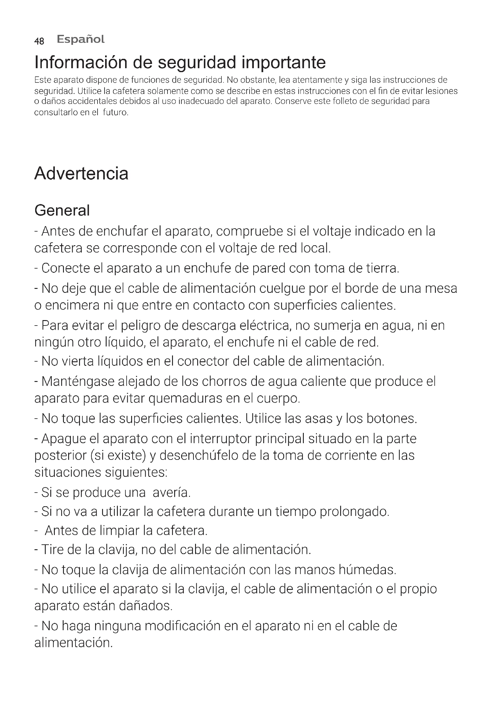 Información de seguridad importante Este aparato dispone de funciones de seguridad. No obstante, lea atentamente y siga las instrucciones de seguridad. Utilice la cafetera solamente como se describe en estas instrucciones con el n de evitar lesiones o daños accidentales debidos al uso inadecuado del aparato. Conserve este folleto de seguridad para consultarlo en el futuro. Advertencia General - Antes de enchufar el aparato, compruebe si el voltaje indicado en la cafetera se corresponde con el voltaje de red local. - Conecte el aparato a un enchufe de pared con toma de tierra. - No deje que el cable de alimentación cuelgue por el borde de una mesa o encimera ni que entre en contacto con supercies calientes. - Para evitar el peligro de descarga eléctrica, no sumerja en agua, ni en ningún otro líquido, el aparato, el enchufe ni el cable de red. - No vierta líquidos en el conector del cable de alimentación. - Manténgase alejado de los chorros de agua caliente que produce el aparato para evitar quemaduras en el cuerpo. - No toque las supercies calientes. Utilice las asas y los botones. - Apague el aparato con el interruptor principal situado en la parte posterior (si existe) y desenchúfelo de la toma de corriente en las situaciones siguientes: - Si se produce una avería. - Si no va a utilizar la cafetera durante un tiempo prolongado. - Antes de limpiar la cafetera. - Tire de la clavija, no del cable de alimentación. - No toque la clavija de alimentación con las manos húmedas. - No utilice el aparato si la clavija, el cable de alimentación o el propio aparato están dañados. - No haga ninguna modicación en el aparato ni en el cable de alimentación.49 Español - Repare el aparato solamente en un centro de servicio autorizado Gaggia para evitar riesgos. - El aparato no debe ser utilizado por niños menores de 8 años de edad. - Este aparato puede ser usado por niños a partir de 8 años y por personas cuya capacidad física, psíquica o sensorial esté reducida o no tengan los conocimientos y la experiencia necesarios, si cuentan con supervisión o formación sobre el uso seguro del aparato y siempre que conozcan los riesgos que conlleva su uso. - Los niños no deben limpiar el aparato ni realizar tareas de mantenimiento a menos que sean mayores de 8 años y cuenten con supervisión. - Mantenga la cafetera y el cable fuera del alcance de los niños menores de 8 años. - Asegúrese de que los niños no jueguen con este aparato. - Tenga cuidado al dispensar agua caliente. La dispensación puede llegar precedida de pequeños chorros de agua caliente. Espere a que el ciclo haya nalizado antes de retirar la boquilla dispensadora de agua caliente. Precaución General - Este aparato está diseñado únicamente para un uso doméstico normal. No se ha diseñado para usarlo en entornos como cocinas para empleados de tiendas, ocinas, granjas u otros entornos laborales. - Coloque siempre el aparato sobre una supercie plana y estable. Manténgalo en posición vertical, incluso durante el transporte. - No coloque el aparato sobre una placa caliente, justo al lado de un horno caliente, un calefactor u otra fuente de calor similar. - Ponga exclusivamente café molido en el portaltro presurizado. Si pone café en grano, café soluble, granos de café crudos o cualquier otra sustancia, la máquina podría dañarse. En ese caso, la reparación que en su caso tuviera que efectuarse no estará cubierta por la garantía.Español
