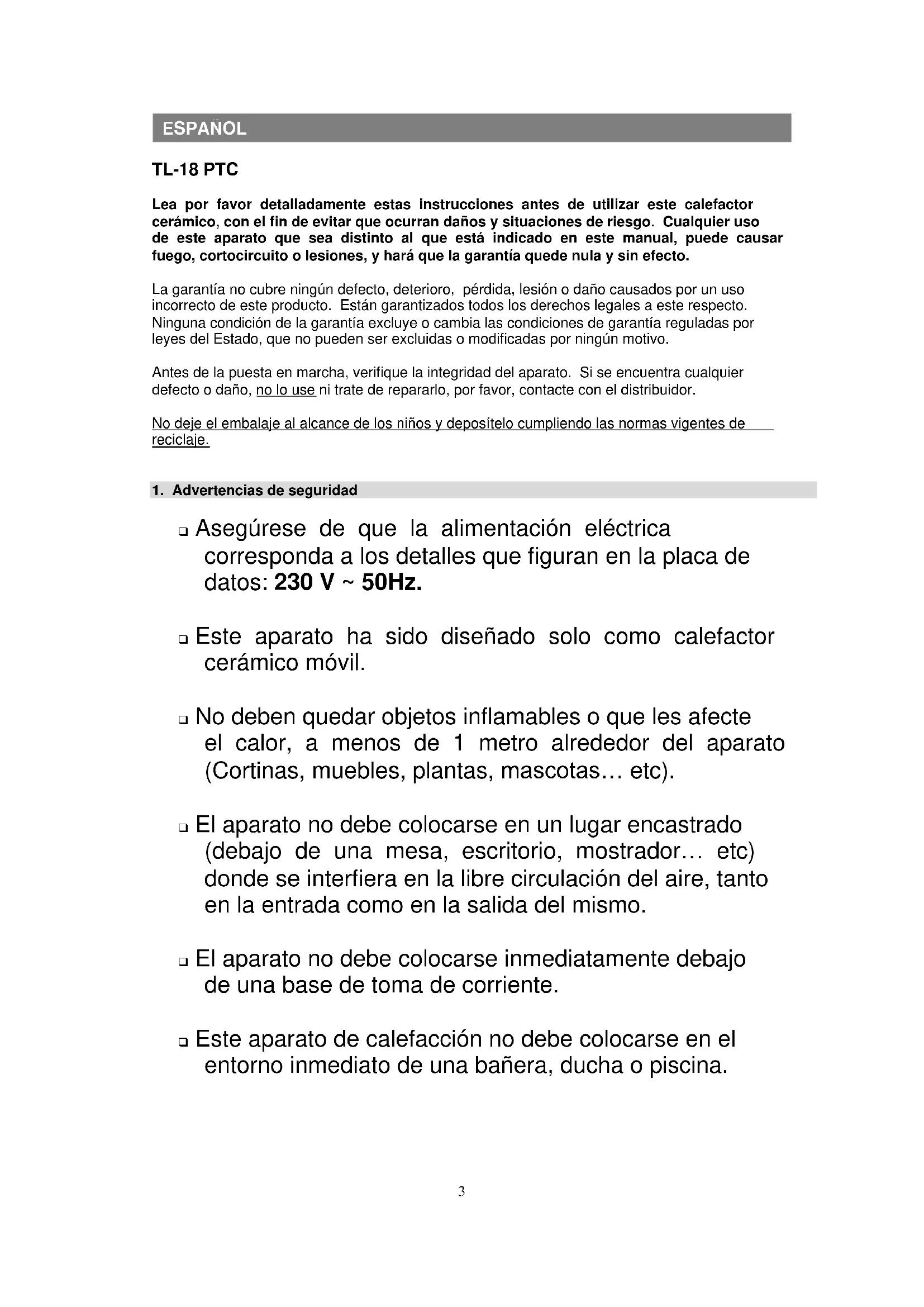 Lea por favor detalladamente estas instrucciones antes de utilizar este calefactor cerámico, con el fin de evitar que ocurran daños y situaciones de riesgo. Cualquier uso de este aparato que sea distinto al que está indicado en este manual, puede causar fuego, cortocircuito o lesiones, y hará que la garantía quede nula y sin efecto.