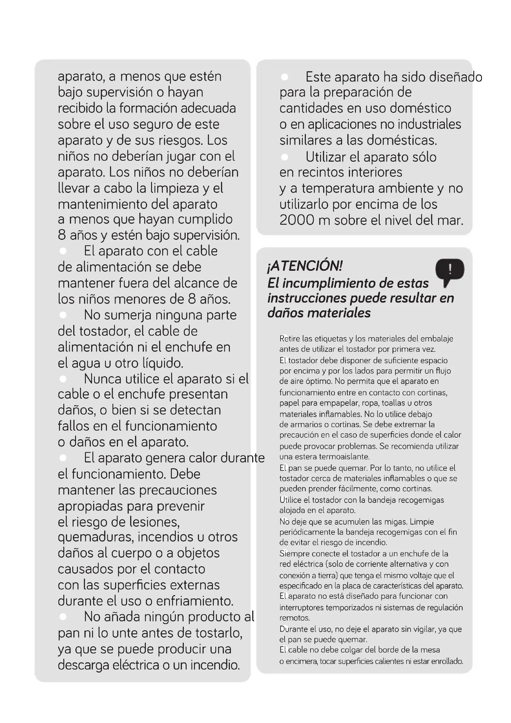 ARaparato, amenos que estén bajo supervisión o hayan recibido la formación adecuada sobre el uso seguro de este aparato y de sus riesgos. Los niños no deberían jugar con el aparato. Los niños no deberían llevar a cabo la limpieza y el mantenimiento del aparato amenos que hayan cumplido 8años yestén bajo supervisión. ● El aparato con el cable de alimentación se debe mantener fuera del alcance de los niños menores de 8 años. ● No sumerja ninguna parte del tostador, el cable de alimentación ni el enchufe en el agua u otro líquido. ● Nunca utilice el aparato si el cable o el enchufe presentan daños, obien si se detectan fallos en el funcionamiento odaños en el aparato. ● El aparato genera calor durante el funcionamiento. Debe mantener las precauciones apropiadas para prevenir el riesgo de lesiones, quemaduras, incendios u otros daños al cuerpo o a objetos causados por el contacto con las superficies externas durante el uso o enfriamiento. ● No añada ningún producto al pan ni lo unte antes de tostarlo, ya que se puede producir una descarga eléctrica o un incendio. ● Este aparato ha sido diseñado para la preparación de cantidades en uso doméstico oen aplicaciones no industriales similares a las domésticas. ● Utilizar el aparato sólo en recintos interiores yatemperatura ambiente yno utilizarlo por encima de los 2000 m sobre el nivel del mar. ¡ATENCIÓN! El incumplimiento de estas instrucciones puede resultar en daños materiales