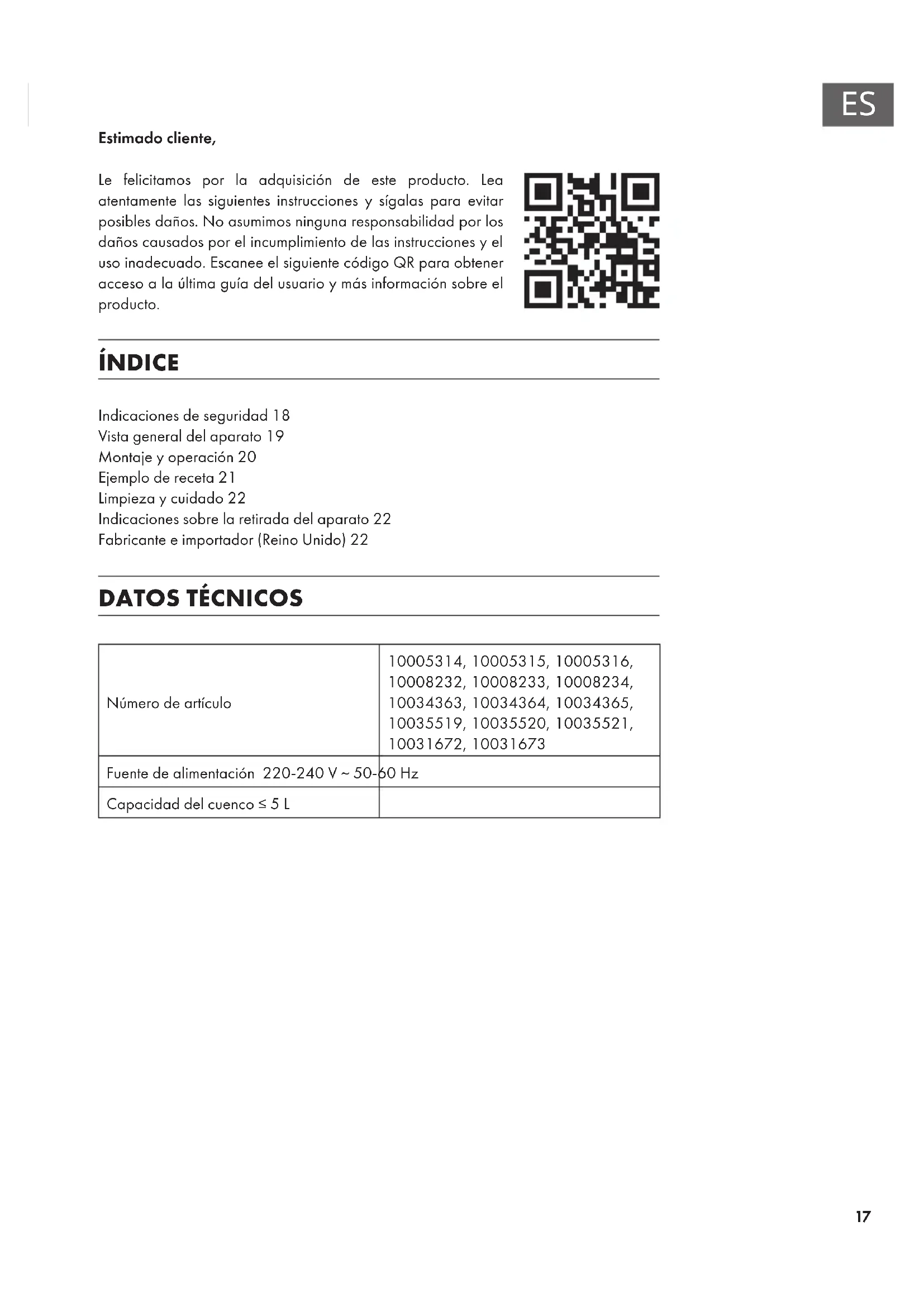 Estimado cliente, Le felicitamos por la adquisición de este producto. Lea atentamente las siguientes instrucciones y sígalas para evitar posibles daños. No asumimos ninguna responsabilidad por los daños causados por el incumplimiento de las instrucciones y el uso inadecuado. Escanee el siguiente código QR para obtener acceso a la última guía del usuario y más información sobre el producto. ÍNDICE Indicaciones de seguridad18 Vista general del aparato19 Montaje y operación20 Ejemplo de receta21 Limpieza y cuidado22 Indicaciones sobre la retirada del aparato22 Fabricante e importador (Reino Unido)22