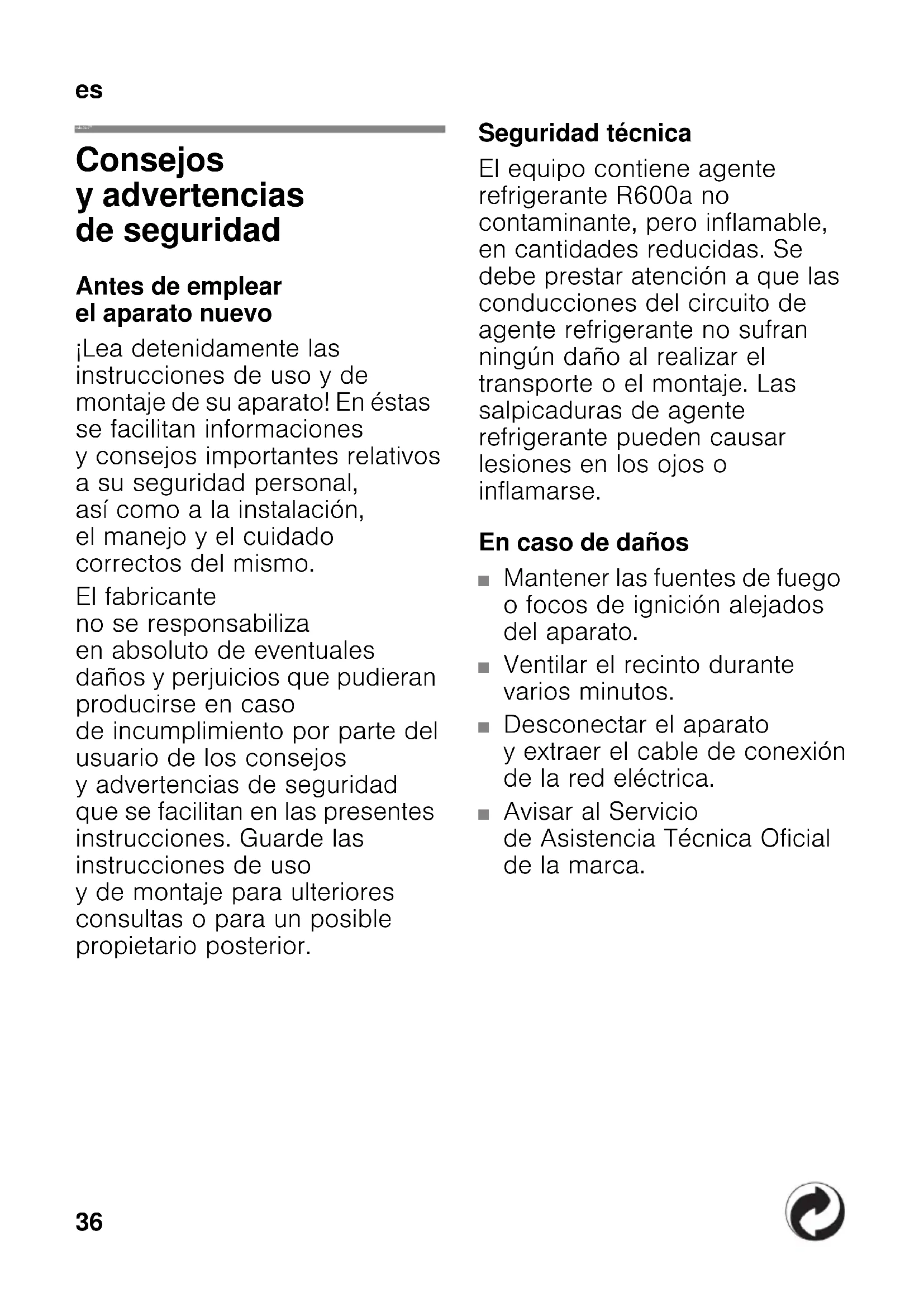 esÍndice esInstrucciones de uso Consejos y advertencias de seguridad Antes de emplear el aparato nuevo ¡Lea detenidamente las instrucciones de uso y de montaje de su aparato! En éstas se facilitan informaciones y consejos importantes relativos a su seguridad personal, así como a la instalación, el manejo y el cuidado correctos del mismo. El fabricante no se responsabiliza en absoluto de eventuales daños y perjuicios que pudieran producirse en caso de incumplimiento por parte del usuario de los consejos y advertencias de seguridad que se facilitan en las presentes instrucciones. Guarde las instrucciones de uso y de montaje para ulteriores consultas o para un posible propietario posterior. Seguridad técnica El equipo contiene agente refrigerante R600a no contaminante, pero inflamable, en cantidades reducidas. Se debe prestar atención a que las conducciones del circuito de agente refrigerante no sufran ningún daño al realizar el transporte o el montaje. Las salpicaduras de agente refrigerante pueden causar lesiones en los ojos o inflamarse. En caso de daños ■ Mantener las fuentes de fuego o focos de ignición alejados del aparato. ■ Ventilar el recinto durante varios minutos. ■ Desconectar el aparato y extraer el cable de conexión de la red eléctrica. ■ Avisar al Servicio de Asistencia Técnica Oficial de la marca.es