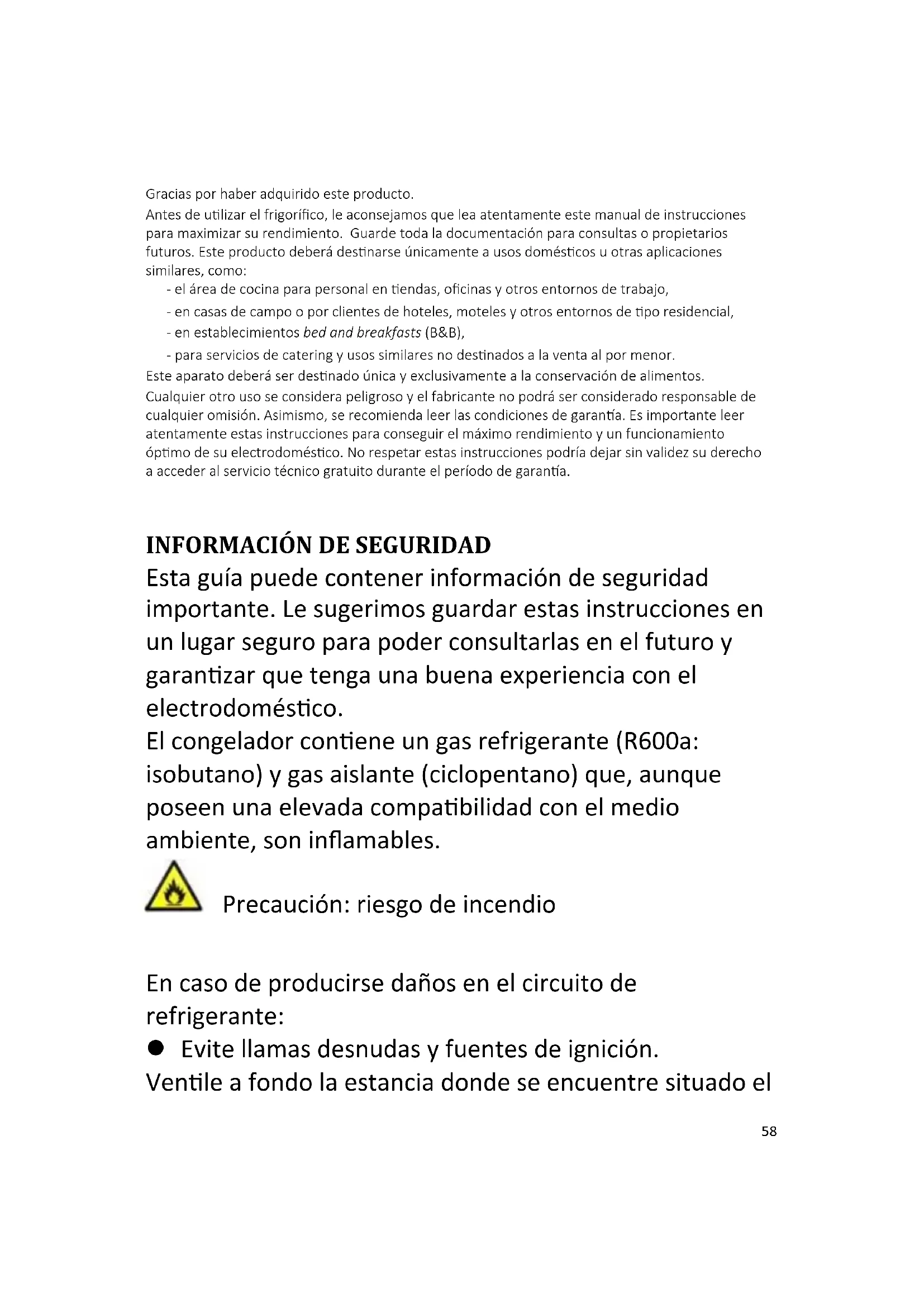 Esta guía puede contener información de seguridad importante. Le sugerimos guardar estas instrucciones en un lugar seguro para poder consultarlas en el futuro y garantizar que tenga una buena experiencia con el electrodoméstico. El congelador contiene un gas refrigerante (R600a: isobutano) y gas aislante (ciclopentano) que, aunque poseen una elevada compatibilidad con el medio ambiente, son inflamables. Precaución: riesgo de incendio En caso de producirse daños en el circuito de refrigerante: Evite llamas desnudas y fuentes de ignición. Ventile a fondo la estancia donde se encuentre situado el59