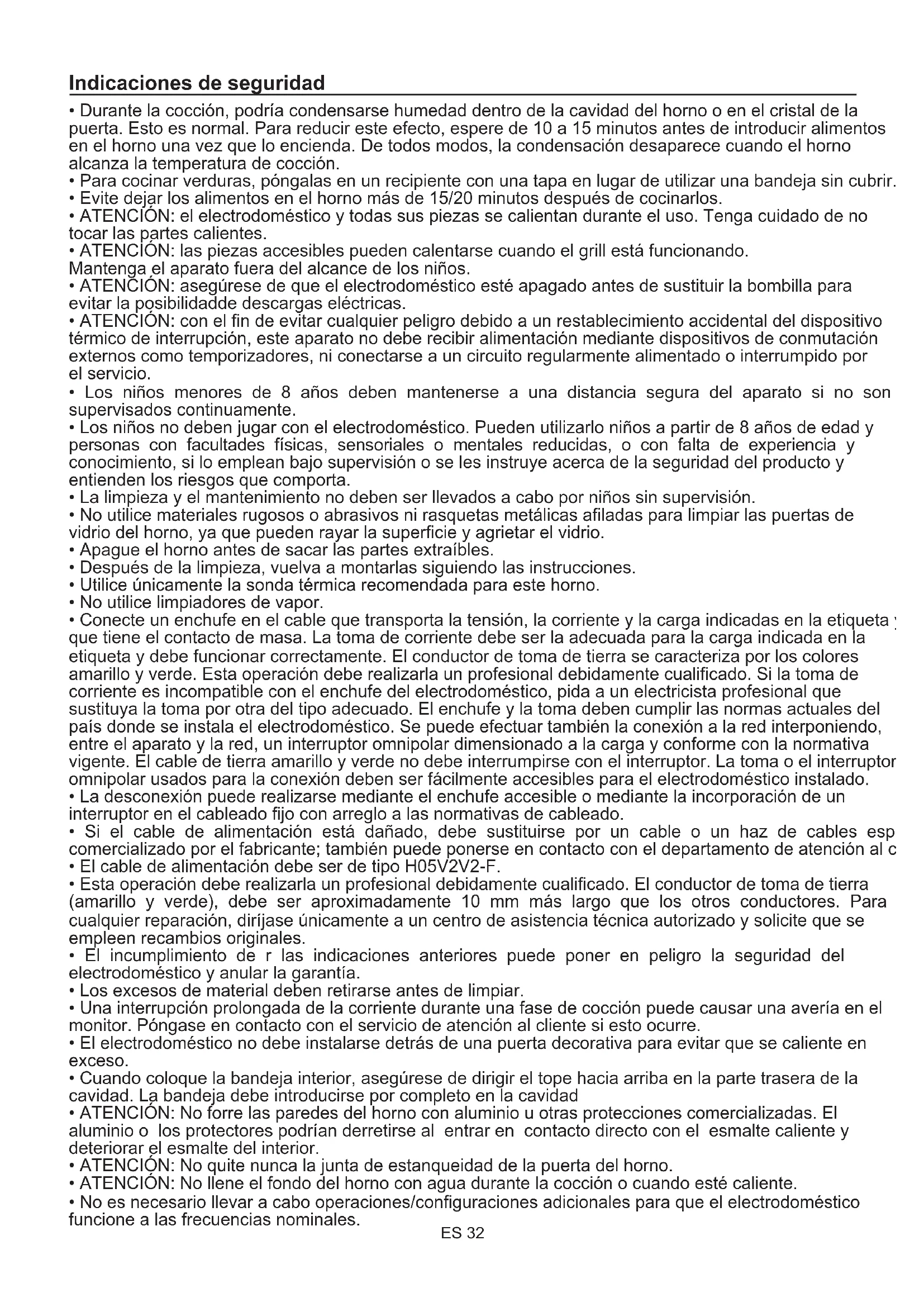 - la configuración del seccionador. La red de alimentación a la que se conecte el horno debe cumplir la normativa vigente en el país de instalación. El fabricante declina toda responsabilidad por eventuales daños derivados de no observar dicha normativa. El horno debe conectarse a la red eléctrica mediante un enchufe de pared con toma de tierra o mediante un seccionador con varios polos, según la normativa vigente en el país de instalación. La red eléctrica debe estar protegida mediante fusibles adecuados y deben utilizarse cables con una sección transversal idónea que garantice una correcta alimentación del horno. CONEXIÓN NOTA: puesto que el horno podría requerir la intervención del servicio de asistencia, es aconsejable prever la disponibilidad de otro enchufe de pared al que conectar el horno después de extraerlo del espacio donde se ha instalado. El cable de alimentación debe sustituirse únicamente por personal de asistencia técnica o por técnicos con una cualificación análoga. - la tensión de alimentación indicada por el medidor; Antes de conectar el horno a la red eléctrica, confíe la comprobación de la continuidad de la toma de tierra de la red eléctrica a un electricista cualificado. El fabricante no se hace responsable de eventuales accidentes u otros problemas derivados de no conectar el horno a tierra o de conectarlo a una toma de tierra con una continuidad defectuosa. Una luz baja alrededor del interruptor principal central podría estar presente cuando el horno está apagado. Este es un comportamiento normal. Se puede quitar simplemente girando el enchufe boca abajo o intercambiando los terminales de suministro. El horno se suministra con un cable de alimentación que debe conectarse únicamente a una red eléctrica con una tensión de 220- 240 V de CA entre fases o entre la fase y el neutro. Antes de conectar el horno a la red eléctrica es imprescindible comprobar: CONFÍE LA CONEXIÓN ELÉCTRICA A UN ELECTRICISTA O A UN TÉCNICO CUALIFICADO. ATENCIÓN El hilo de toma de tierra conectado al terminal de tierra del horno debe estar conectado al terminal de tierra de la red eléctrica. Una limpieza mínima después de utilizar el horno ayudará a mantenerlo limpio durante más tiempo. No forrar las paredes del horno con aluminio u otras protecciones disponibles en tiendas. El aluminio o los protectores, en contacto directo con el esmalte caliente puede derretirse y deteriorar el esmalte del interior. Para evitar un exceso de suciedad en el horno y que pueden derivar en olores y humo en exceso, recomendamos no utilizar el horno a temperaturas muy elevadas. Es mejor ampliar el tiempo de cocción y bajar un poco la temperatura.