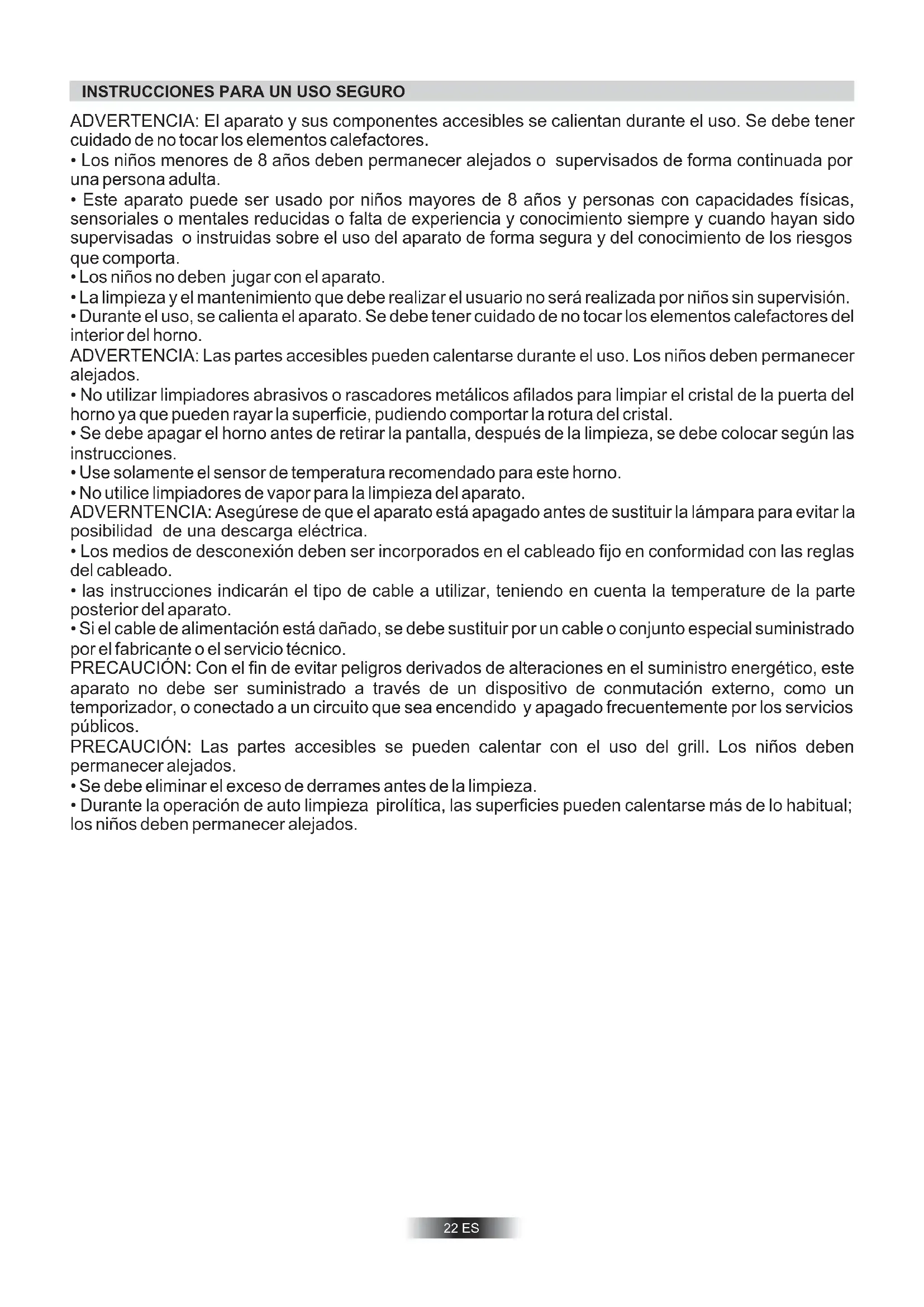 - Durante la operación de auto limpieza pirolítica, las superficies pueden calentarse más de lo habitual; los niños deben permanecer alejados.