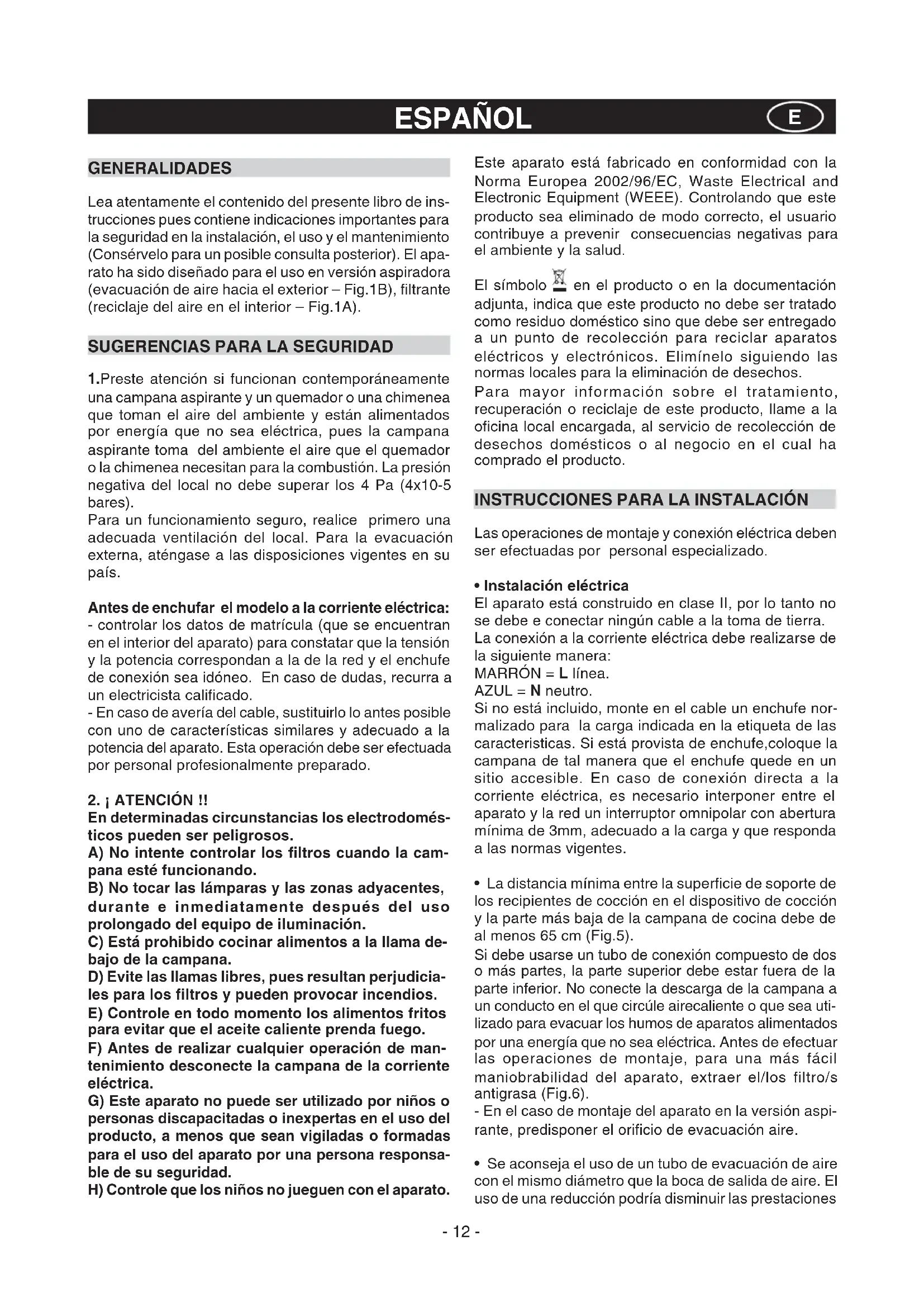 En determinadas circunstancias los electrodomés- ticos pueden ser peligrosos. A) No intente controlar los filtros cuando la cam- pana esté funcionando. B) No tocar las lámparas y las zonas adyacentes, durante e inmediatamente después del uso prolongado del equipo de iluminación. C) Está prohibido cocinar alimentos a la llama de- bajo de la campana. D) Evite las llamas libres, pues resultan perjudicia- les para los filtros y pueden provocar incendios. E) Controle en todo momento los alimentos fritos para evitar que el aceite caliente prenda fuego. F) Antes de realizar cualquier operación de man- tenimiento desconecte la campana de la corriente eléctrica. G) Este aparato no puede ser utilizado por niños o personas discapacitadas o inexpertas en el uso del producto, a menos que sean vigiladas o formadas para el uso del aparato por una persona responsa- ble de su seguridad. H) Controle que los niños no jueguen con el aparato. Este aparato está fabricado en conformidad con la Norma Europea 2002/96/EC, Waste Electrical and Electronic Equipment (WEEE). Controlando que este producto sea eliminado de modo correcto, el usuario contribuye a prevenir consecuencias negativas para el ambiente y la salud. El símbolo en el producto o en la documentación adjunta, indica que este producto no debe ser tratado como residuo doméstico sino que debe ser entregado a un punto de recolección para reciclar aparatos eléctricos y electrónicos. Elimínelo siguiendo las normas locales para la eliminación de desechos. Para mayor información sobre el tratamiento, recuperación o reciclaje de este producto, llame a la oficina local encargada, al servicio de recolección de desechos domésticos o al negocio en el cual ha comprado el producto.