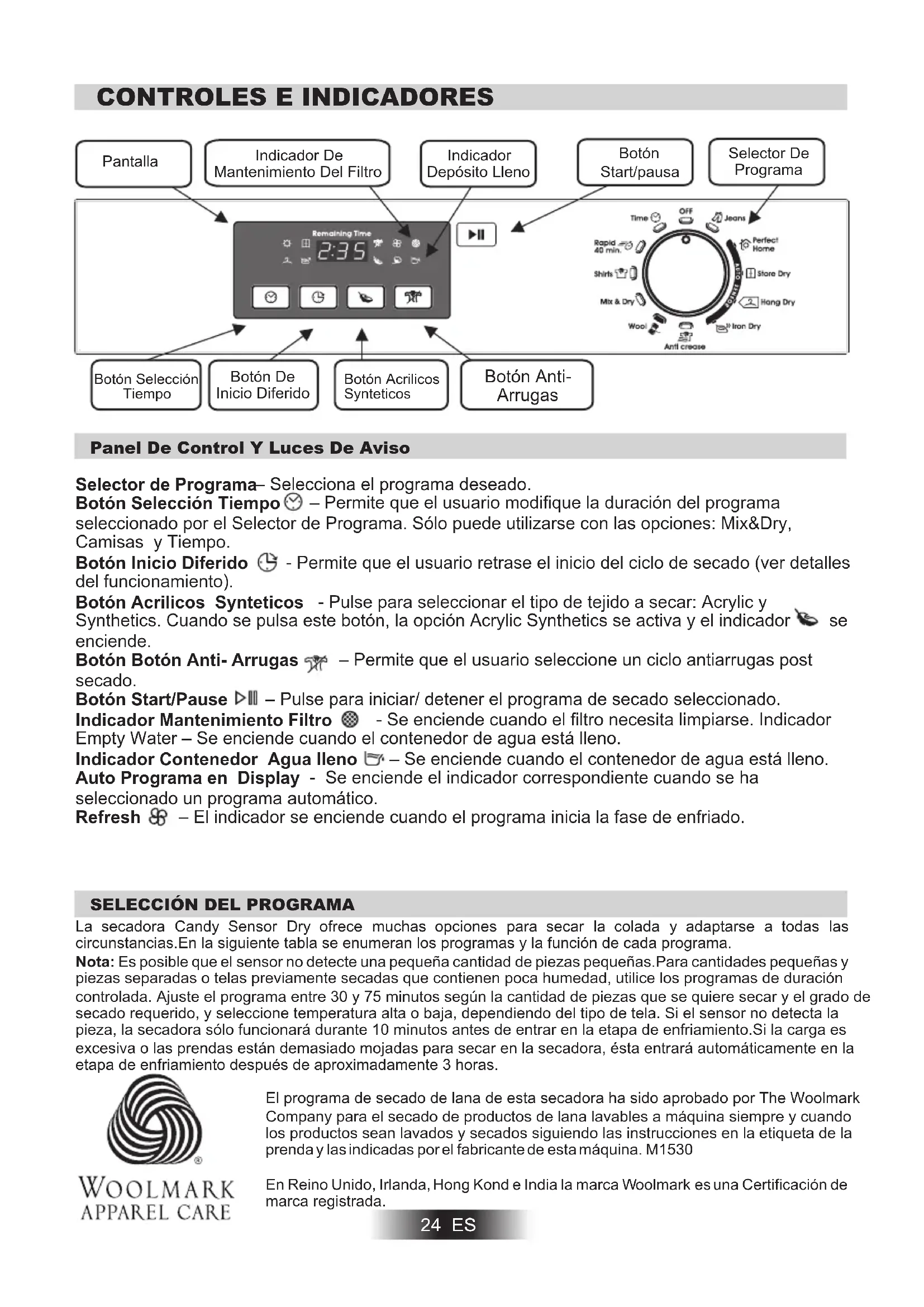 Advertencias sobre seguridad Desagüe: Instrucciones de Colocación Preparación del material para secar Controles e indicadores Selección del programa Puerta y filtro Depósito del agua Operación Limpieza y mantenimiento de rutina Resolución de problemas Servicio de atención al clienteCONTROLES E INDICADORES Panel De Control Y Luces De Aviso 24 ES Botón Start/pausa Botón Selección TiempoBotón Acrilicos Synteticos Botón Anti- Arrugas Botón De Inicio Diferido Selector De Programa Pantalla Indicador Depósito Lleno Indicador De Mantenimiento Del Filtro Selector de Programa – Permite que el usuario modifique la duración del programa seleccionado por el Selector de Programa. Sólo puede utilizarse con las opciones: Mix&Dry, Camisas y Tiempo. - Permite que el usuario retrase el inicio del ciclo de secado (ver detalles del funcionamiento). - Pulse para seleccionar el tipo de tejido a secar: Acrylic y Synthetics. Cuando se pulsa este botón, la opción Acrylic Synthetics se activa y el indicador se enciende. – Permite que el usuario seleccione un ciclo antiarrugas post secado. Botón Start/Pause Indicador Mantenimiento Filtro Indicador Contenedor Agua lleno Auto Programa en Display Refresh – Selecciona el programa deseado. Botón Selección Tiempo Botón Inicio Diferido Botón Acrilicos Synteticos Botón Botón Anti- Arrugas – Pulse para iniciar/ detener el programa de secado seleccionado. - Se enciende cuando el filtro necesita limpiarse. Indicador Empty Water – Se enciende cuando el contenedor de agua está lleno. – Se enciende cuando el contenedor de agua está lleno. - Se enciende el indicador correspondiente cuando se ha seleccionado un programa automático. – El indicador se enciende cuando el programa inicia la fase de enfriado. La secadora Candy Sensor Dry ofrece muchas opciones para secar la colada y adaptarse a todas las circunstancias.En la siguiente tabla se enumeran los programas y la función de cada programa. Nota: Es posible que el sensor no detecte una pequeña cantidad de piezas pequeñas.Para cantidades pequeñas y piezas separadas o telas previamente secadas que contienen poca humedad, utilice los programas de duración controlada. Ajuste el programa entre 30 y 75 minutos según la cantidad de piezas que se quiere secar y el grado de secado requerido, y seleccione temperatura alta o baja, dependiendo del tipo de tela. Si el sensor no detecta la pieza, la secadora sólo funcionará durante 10 minutos antes de entrar en la etapa de enfriamiento.Si la carga es excesiva o las prendas están demasiado mojadas para secar en la secadora, ésta entrará automáticamente en la etapa de enfriamiento después de aproximadamente 3 horas.
