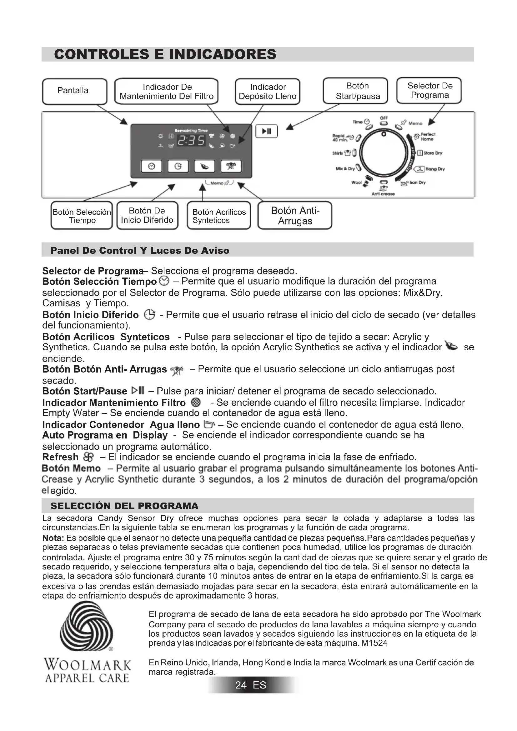 Panel De Control Y Luces De Aviso 24 ES BotónStart/pausaBotón Selección TiempoBotón Acrilicos Synteticos Botón Anti- Arrugas Botón DeInicio DiferidoSelector DeProgramaPantallaIndicadorDepósito LlenoIndicador DeMantenimiento Del Filtro Selector de Programa – Permite que el usuario modifique la duración del programa seleccionado por el Selector de Programa. Sólo puede utilizarse con las opciones: Mix&Dry, Camisas y Tiempo. - Permite que el usuario retrase el inicio del ciclo de secado (ver detalles del funcionamiento). - Pulse para seleccionar el tipo de tejido a secar: Acrylic y Synthetics. Cuando se pulsa este botón, la opción Acrylic Synthetics se activa y el indicador se enciende. – Permite que el usuario seleccione un ciclo antiarrugas post secado. Botón Start/Pause Indicador Mantenimiento Filtro Indicador Contenedor Agua lleno Auto Programa en Display Refresh – Selecciona el programa deseado. Botón Selección Tiempo Botón Inicio Diferido Botón Acrilicos Synteticos Botón Botón Anti- Arrugas – Pulse para iniciar/ detener el programa de secado seleccionado. - Se enciende cuando el filtro necesita limpiarse. Indicador Empty Water – Se enciende cuando el contenedor de agua está lleno. – Se enciende cuando el contenedor de agua está lleno. - Se enciende el indicador correspondiente cuando se ha seleccionado un programa automático. – El indicador se enciende cuando el programa inicia la fase de enfriado. egido. El programa de secado de lana de esta secadora ha sido aprobado por The Woolmark Company para el secado de productos de lana lavables a máquina siempre y cuando los productos sean lavados y secados siguiendo las instrucciones en la etiqueta de la prenda y las indicadas por el fabricante de esta máquina. M1524 En Reino Unido, Irlanda, Hong Kond e India la marca Woolmark es una Certificación de marca registrada.SELECCIÓN DEL PROGRAMA 25 ES PROGRAMA Perfect Home Perfect Home Seco Seco Listo Para Guardar Listo Para Guardar Listo Para Planchar Listo Para Planchar Lana R pido á 40 Min. Mezclar&Secar Camisas Tiempo Memo Anti Crease. DESCRIPCIÓN Prendas de lana: el programa puede ser utilizado para secar hasta 1kg de colada (alrededor de 6 jerseys). se aconseja de hacer girar la ropa antes de secarla.El tiempo puede variar según las dimensiones, la densidad de la carga y del centrifugado seleccionado en el lavado.Al final del ciclo, las prendas están listas para ser utilizadas, pero en el caso de aquellas más pesadas, los bordes podrían estar ligeramente húmedas: se sugiere de secarlas naturalmente.Se aconseja extraer de inmediato las prendas al final del ciclo de secado.Atención: el proceso de encogimiento de la lana es irreversible, secar las prendas exclusivamente que contengan el simbolo (simbolo "ok tumble"), este programa no está pensado para acrílicos. El programa Rápido 40' permite completar rápidamente un ciclo de secado. Es un programa ideal para tener ropa seca, fresca y lista para poner en menos de 40'. Este programa especial controla constantemente la temperatura dentro del tambor. La carga máxima es de 2 kg y el programa es adecuado para todo tipo de tejidos que admitan el secado al aire libre.PUERTA Y FILTRO Filtro 26 ES Tire de la palanca para abrir la puerta. Para poner la secadora en marcha nuevamente, cierre la puerta y presione. ADVERTENCIA! Cuando la secadora está en uso, el cesto y la puerta pueden estar muy calientes.Nunca detenga la secadora antes de que el final del ciclo de secado a menos que todos los artículos son rápidamente extraídos y extendidos para disipar el calor. Indicador Cuidado del Filtro Se enciende cuando el filtro necesita limpieza. Revise y limpie el filtro principal en la puerta y el condensador situado en laparte inferior de la secadora. Si la ropa no está seca controle que el filtro no esté obstruido. IMPORTANTE: Para mantener la eficiencia de la Compruebe que el filtro de la secadora esté limpio de pelusa antes de cada ciclo de secado.No haga funcionar la secadora sin el filtro.Los filtros tapados u obstruidos pueden aumentar el tiempo de secado y causar daños que pueden dar lugar a altos costos de reparación.