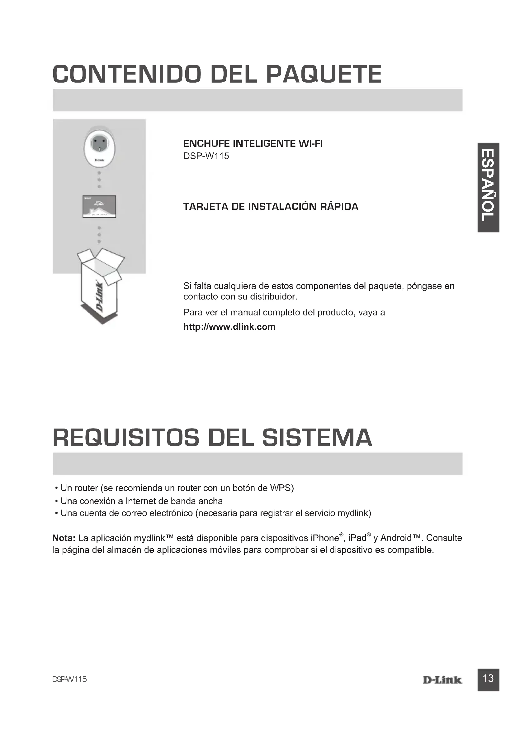 y Android™. Consulte la página del almacén de aplicaciones móviles para comprobar si el dispositivo es compatible. Si falta cualquiera de estos componentes del paquete, póngase en contacto con su distribuidor. Para ver el manual completo del producto, vaya a http://www.dlink.com