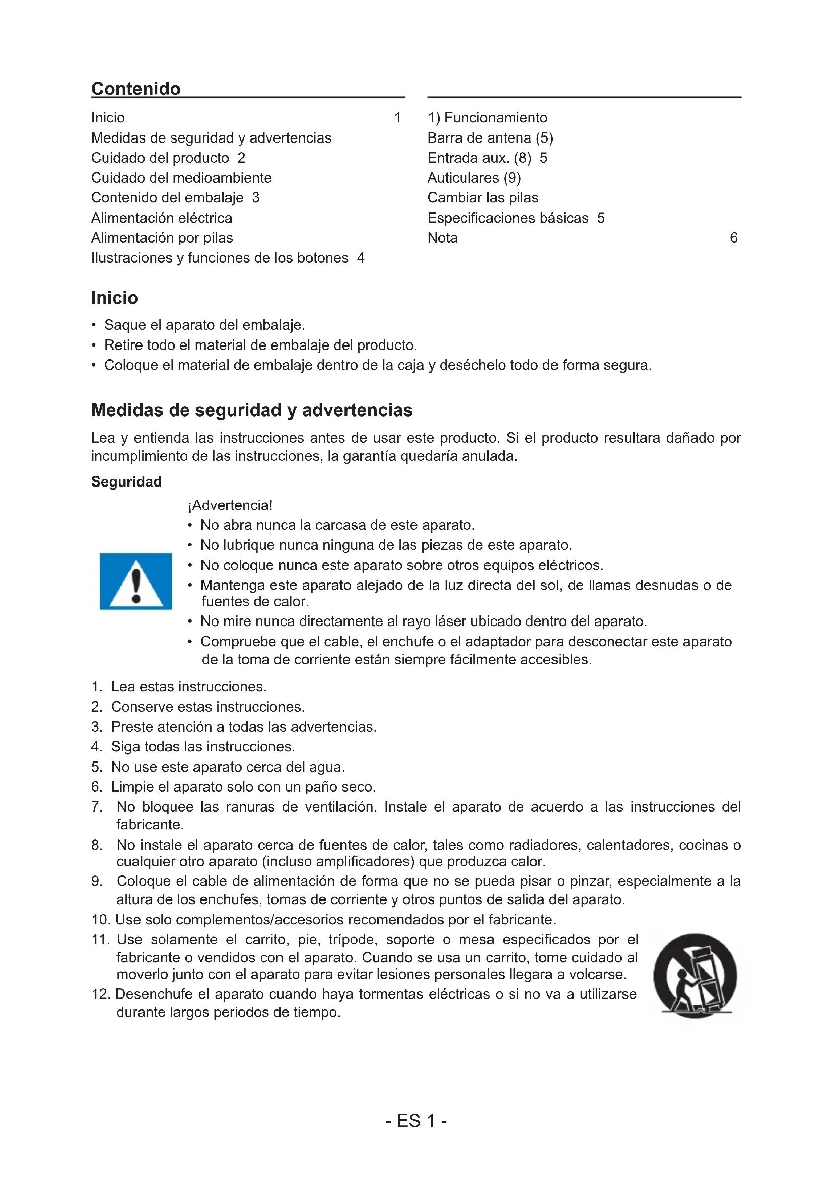 LE ROGAMOS QUE LEA ÍNTEGRAMENTE EL PRESENTE MANUAL DEL USUARIO ANTES DE UTILIZAR EL EQUIPO Y QUE CONSERVE ESTE FOLLETO PARA PODER CONSULTARLO EN EL FUTURO. ES- ES 1 - Contenido Inicio 1 Medidas de seguridad y advertencias Cuidado del producto 2 Cuidado del medioambiente Contenido del embalaje 3 Alimentación eléctrica Alimentación por pilas Ilustraciones y funciones de los botones 4