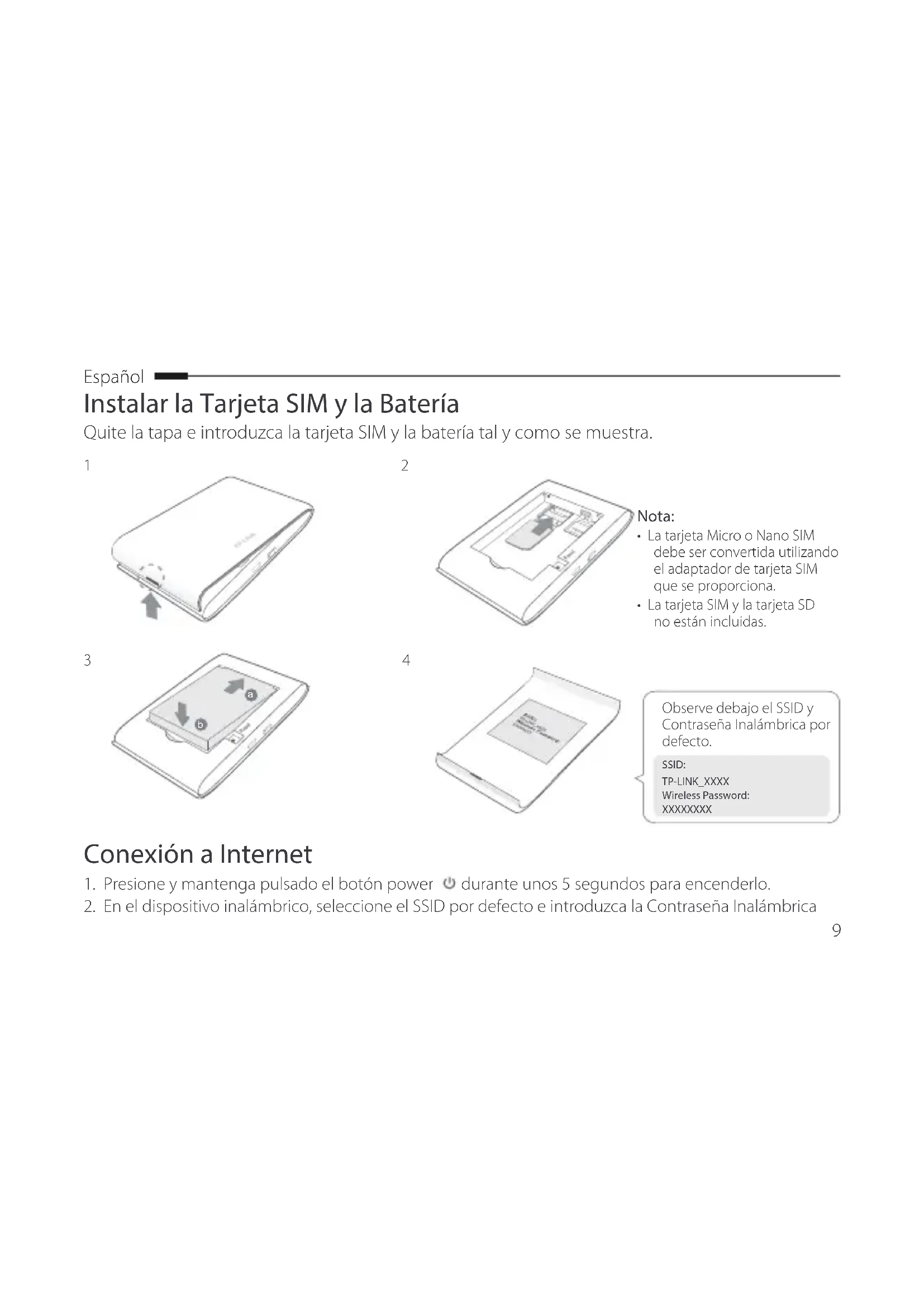 SSID:TP-LINK_XXXXWireless Password:XXXXXXXX10 Español en la parte interior de la tapa. Nota: Recomendamos encarecidamente que cambie el nombre y contraseña inalámbricos por defecto por seguridad en la red. ¡Disfrute! Nota: