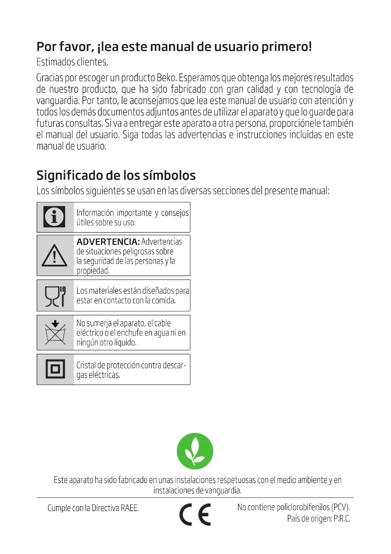 ADVERTENCIA: Advertencias de situaciones peligrosas sobre la seguridad de las personas y la propiedad. Los materiales están diseñados para estar en contacto con la comida. No sumerja el aparato, el cable eléctrico o el enchufe en agua ni en ningún otro líquido. Cristal de protección contra descar- gas eléctricas. Este aparato ha sdo fabrcado en unas nstalacones respetuosas con el medo ambente y en nstalacones de vanguarda. Cumple con la Drectva RAEE. No contene polclorobfenlos (PCV). País de orgen: P.R.C.36 / ES Picadora / Manual de usuario