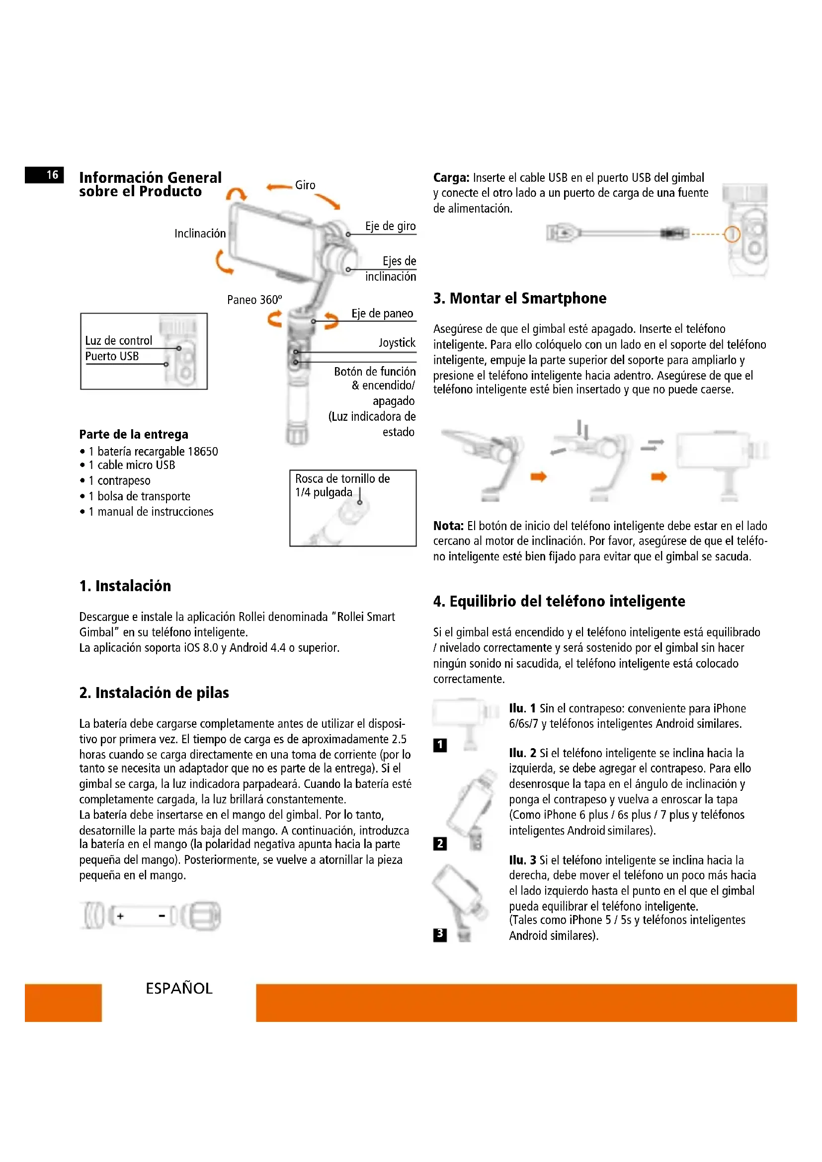 Si el gimbal está encendido y el teléfono inteligente está equilibrado / nivelado correctamente y será sostenido por el gimbal sin hacer ningún sonido ni sacudida, el teléfono inteligente está colocado correctamente. Ilu. 1 Sin el contrapeso: conveniente para iPhone 6/6s/7 y teléfonos inteligentes Android similares. Ilu. 2 Si el teléfono inteligente se inclina hacia la izquierda, se debe agregar el contrapeso. Para ello desenrosque la tapa en el ángulo de inclinación y ponga el contrapeso y vuelva a enroscar la tapa (Como iPhone 6 plus / 6s plus / 7 plus y teléfonos inteligentes Android similares). Ilu. 3 Si el teléfono inteligente se inclina hacia la derecha, debe mover el teléfono un poco más hacia el lado izquierdo hasta el punto en el que el gimbal pueda equilibrar el teléfono inteligente. (Tales como iPhone 5 / 5s y teléfonos inteligentes Android similares). Información General sobre el Producto