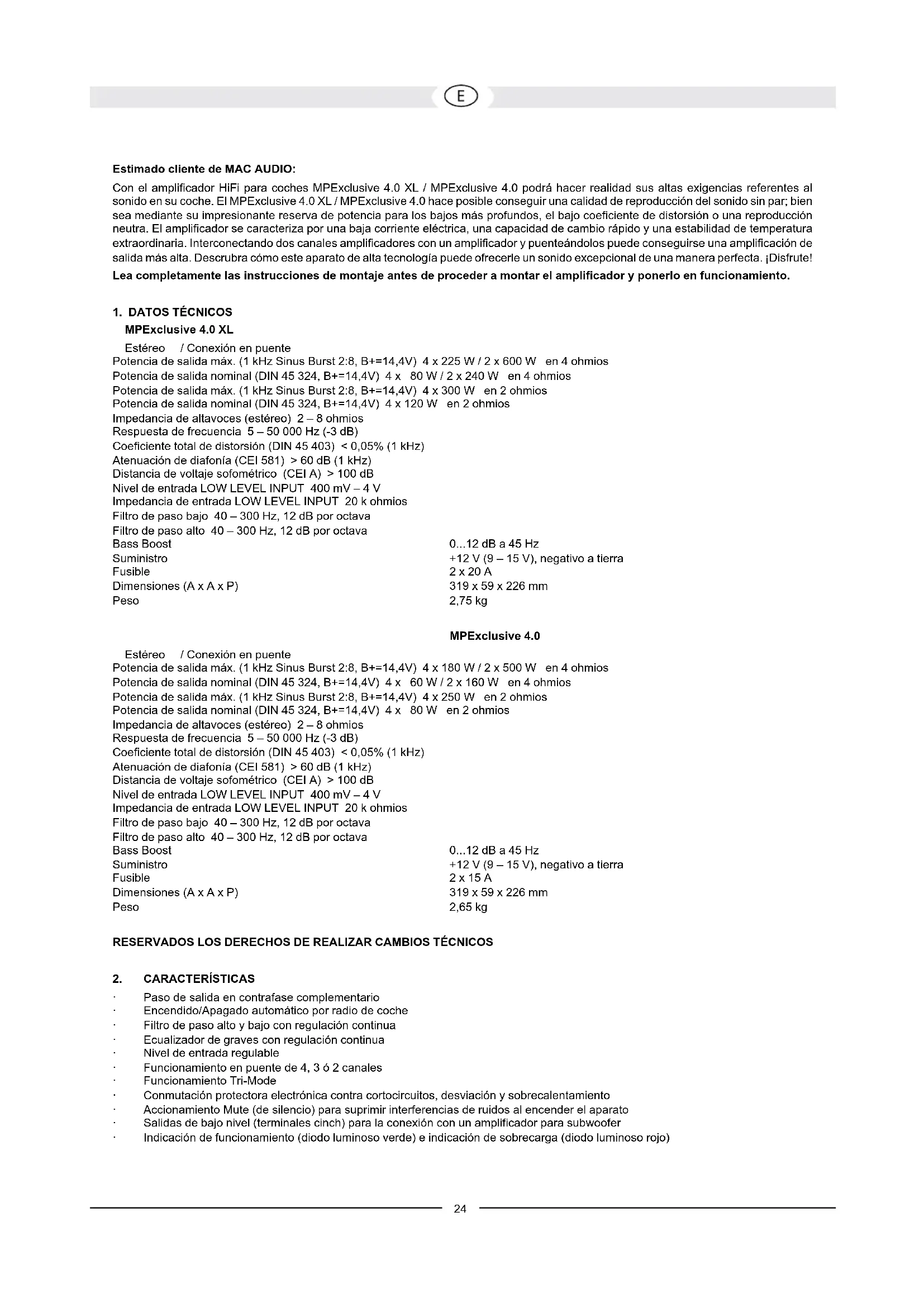 MPExclusive 4.0 XL Estéreo / Conexión en puente Potencia de salida máx. (1 kHz Sinus Burst 2:8, B+=14,4V) 4 x 225 W / 2 x 600 W en 4 ohmios Potencia de salida nominal (DIN 45 324, B+=14,4V) 4 x 80 W / 2 x 240 W en 4 ohmios Potencia de salida máx. (1 kHz Sinus Burst 2:8, B+=14,4V) 4 x 300 W en 2 ohmios Potencia de salida nominal (DIN 45 324, B+=14,4V) 4 x 120 W en 2 ohmios Impedancia de altavoces (estéreo) 2 – 8 ohmios Respuesta de frecuencia 5 – 50 000 Hz (-3 dB) Coeficiente total de distorsión (DIN 45 403) < 0,05% (1 kHz) Atenuación de diafonía (CEI 581) > 60 dB (1 kHz) Distancia de voltaje sofométrico (CEI A) > 100 dB Nivel de entrada LOW LEVEL INPUT 400 mV – 4 V Impedancia de entrada LOW LEVEL INPUT 20 k ohmios Filtro de paso bajo 40 – 300 Hz, 12 dB por octava Filtro de paso alto 40 – 300 Hz, 12 dB por octava Bass Boost 0...12 dB a 45 Hz Suministro +12 V (9 – 15 V), negativo a tierra Fusible 2 x 20 A Dimensiones (A x A x P) 319 x 59 x 226 mm Peso 2,75 kg MPExclusive 4.0 Estéreo / Conexión en puente Potencia de salida máx. (1 kHz Sinus Burst 2:8, B+=14,4V) 4 x 180 W / 2 x 500 W en 4 ohmios Potencia de salida nominal (DIN 45 324, B+=14,4V) 4 x 60 W / 2 x 160 W en 4 ohmios Potencia de salida máx. (1 kHz Sinus Burst 2:8, B+=14,4V) 4 x 250 W en 2 ohmios Potencia de salida nominal (DIN 45 324, B+=14,4V) 4 x 80 W en 2 ohmios Impedancia de altavoces (estéreo) 2 – 8 ohmios Respuesta de frecuencia 5 – 50 000 Hz (-3 dB) Coeficiente total de distorsión (DIN 45 403) < 0,05% (1 kHz) Atenuación de diafonía (CEI 581) > 60 dB (1 kHz) Distancia de voltaje sofométrico (CEI A) > 100 dB Nivel de entrada LOW LEVEL INPUT 400 mV – 4 V Impedancia de entrada LOW LEVEL INPUT 20 k ohmios Filtro de paso bajo 40 – 300 Hz, 12 dB por octava Filtro de paso alto 40 – 300 Hz, 12 dB por octava Bass Boost 0...12 dB a 45 Hz Suministro +12 V (9 – 15 V), negativo a tierra Fusible 2 x 15 A Dimensiones (A x A x P) 319 x 59 x 226 mm Peso 2,65 kg RESERVADOS LOS DERECHOS DE REALIZAR CAMBIOS TÉCNICOS