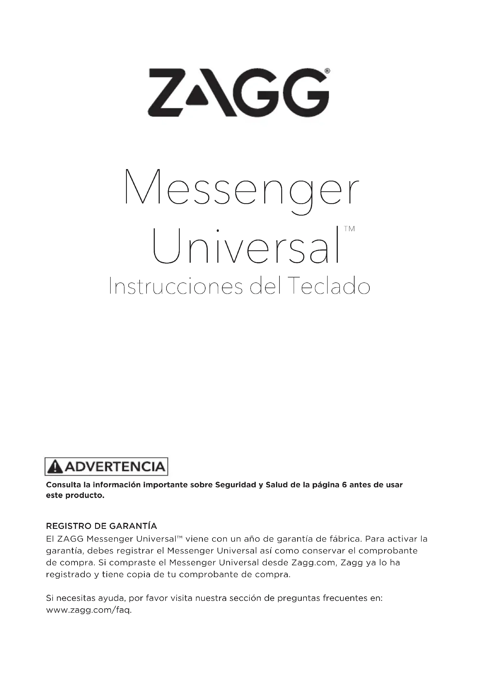 normes ou des recommandations de recyclage de produits électroniques en vigueur dans votre région. Veuillez lire les précautions et les informations concernant le fonctionnement avant d’utiliser votre clavier ou tout autre accessoire qui l’accompagne. Conservez ces informations pour une utilisation ultérieure.REGISTRO DE GARANTÍA El ZAGG Messenger Universal™ viene con un año de garantía de fábrica. Para activar la garantía, debes registrar el Messenger Universal así como conservar el comprobante de compra. Si compraste el Messenger Universal desde Zagg.com, Zagg ya lo ha registrado y tiene copia de tu comprobante de compra. Si necesitas ayuda, por favor visita nuestra sección de preguntas frecuentes en: www.zagg.com/faq. Consulta la información importante sobre Seguridad y Salud de la página 6 antes de usar este producto. Instrucciones del Teclado Messenger Universal