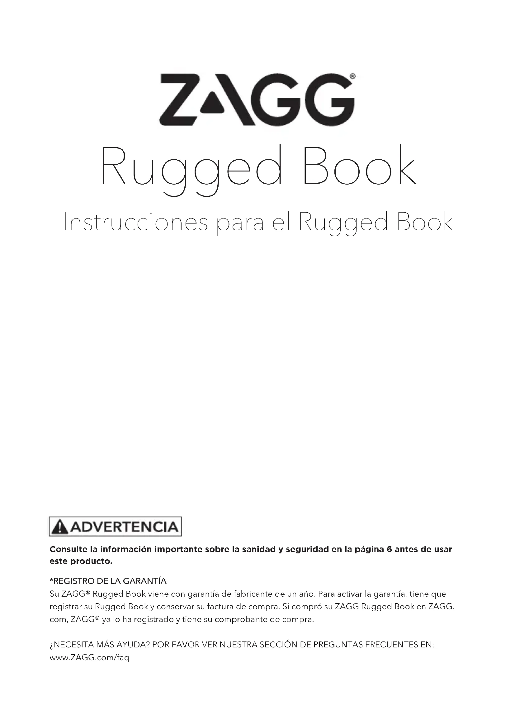 Su ZAGG® Rugged Book viene con garantía de fabricante de un año. Para activar la garantía, tiene que registrar su Rugged Book y conservar su factura de compra. Si compró su ZAGG Rugged Book en ZAGG. com, ZAGG® ya lo ha registrado y tiene su comprobante de compra. ¿NECESITA MÁS AYUDA? POR FAVOR VER NUESTRA SECCIÓN DE PREGUNTAS FRECUENTES EN: www.ZAGG.com/faqINSERTAR/REMOVER SU TABLETA Para insertar su tableta dentro del Rugged Book abra el estuche del Book y retírelo del teclado (para realizar esto, levante el estuche y remuévalo del teclado). En seguida, alinee su tableta con los orificios en el estuche. Asegúrese que el orificio de la cámara esté correctamente alineado, así como la abertura para el conector. Cuando todo esté ordenado, coloque la parte inferior de su tableta en el estuche y aplique cierta presión para comprobar que esté debidamente instalado. Suelte la mitad superior de su tableta en el estuche. Chequee todos los ángulos para cerciorarse de que éstos hayan sido adecuadamente colocados. Cuando su tableta esté protegida en su estuche, usted puede conectarla al teclado, poniéndolo a través del magnético. Pontentes imanes lo asegurarán debidamente, pero también le permitirá retirar su tableta en el momento que le parezca conveniente. Para retirar fácilmente su tableta del estuche, separe este último del teclado y, luego, muy suavemente retire la goma sobremoldeada de los bordes mientras presiona la tableta por detrás. Sujete el lado expuesto de su tableta y levante/ arranque del Rugged Book.
