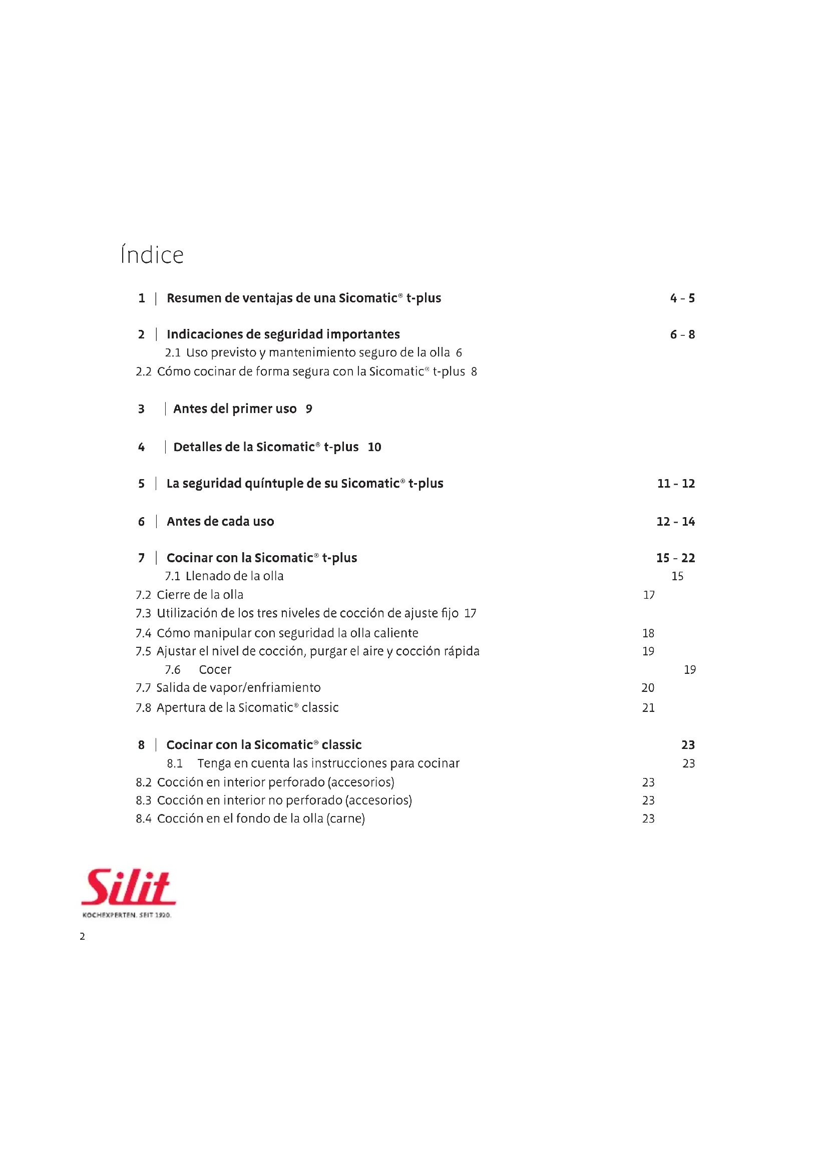 3 | Antes del primer uso 9 4 | Detalles de la Sicomatic® t-plus 10 5 | La seguridad quíntuple de su Sicomatic® t-plus 11 - 12 6 | Antes de cada uso 12 - 14 7 | Cocinar con la Sicomatic® t-plus 15 - 22