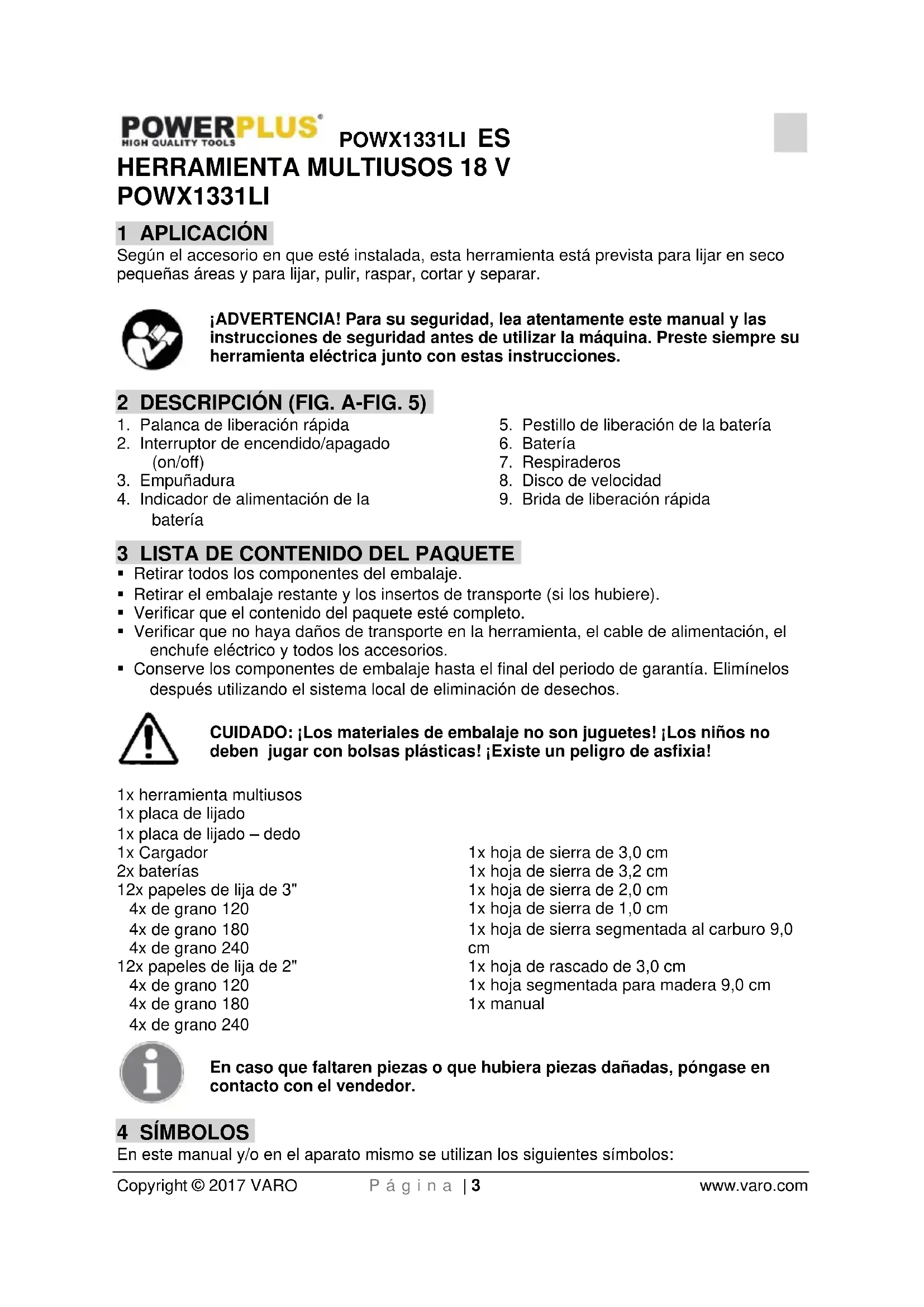 1x hoja de rascado de 3,0 cm 1x hoja segmentada para madera 9,0 cm 1x manual En caso que faltaren piezas o que hubiera piezas dañadas, póngase en contacto con el vendedor. 4 SÍMBOLOS En este manual y/o en el aparato mismo se utilizan los siguientes símbolos:POWX1331LI ES Copyright © 2017 VARO P á g i n a | 4 www.varo.com