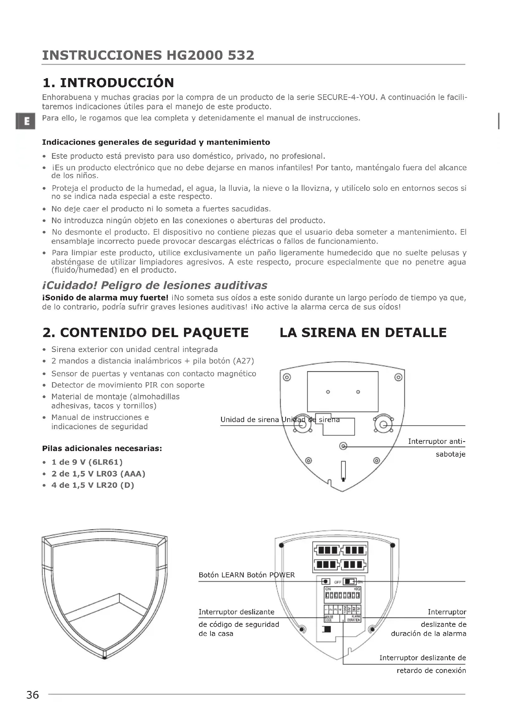 - 4 de 1,5 V LR20 (D) Unidad de sirena Unidad de sirena Interruptor anti- sabotaje Botón LEARN Botón POWER Interruptor deslizante de duración de la alarma Interruptor deslizante de código de seguridad de la casa Interruptor deslizante de retardo de conexión37 INSTRUCCIONES HG2000 532