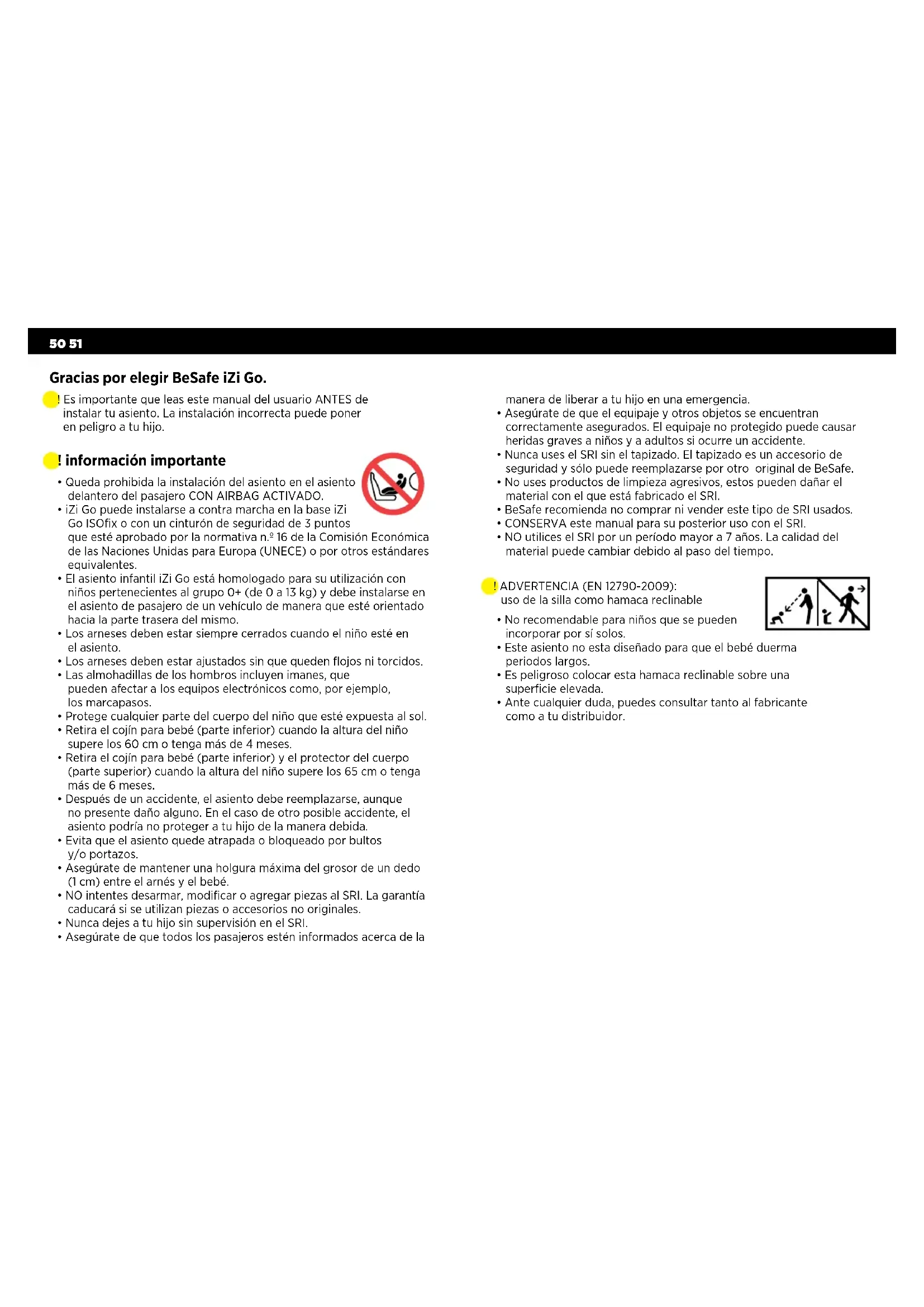 - Asegúrate de que todos los pasajeros estén informados acerca de la Gracias por elegir BeSafe iZi Go. ! Es importante que leas este manual del usuario ANTES de instalar tu asiento. La instalación incorrecta puede poner en peligro a tu hijo. ! ADVERTENCIA (EN 12790-2009): uso de la silla como hamaca reclinable manera de liberar a tu hijo en una emergencia.