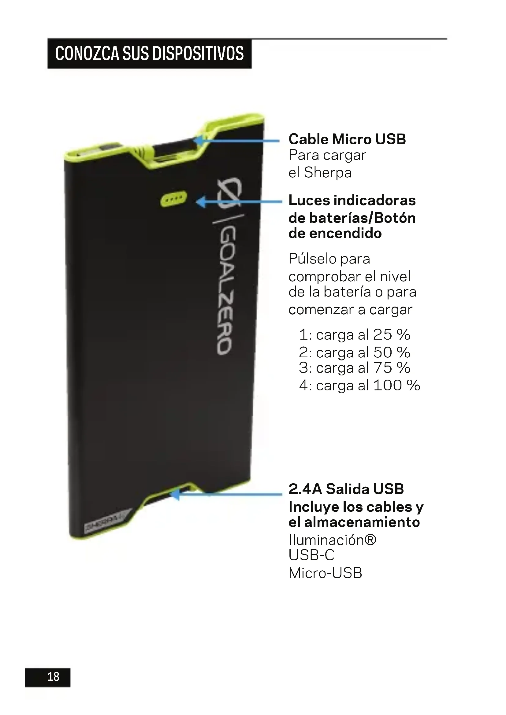 2.4A Salida USB Incluye los cables y el almacenamiento Iluminación® USB-C Micro-USB Luces indicadoras debaterías/Botón deencendido Púlselo para comprobar el nivel de la batería o para comenzar a cargar 1: carga al 25 % 2: carga al 50 % 3: carga al 75 % 4: carga al 100 % Cable Micro USB Para cargar el Sherpa18 19 QUÉ CARGA