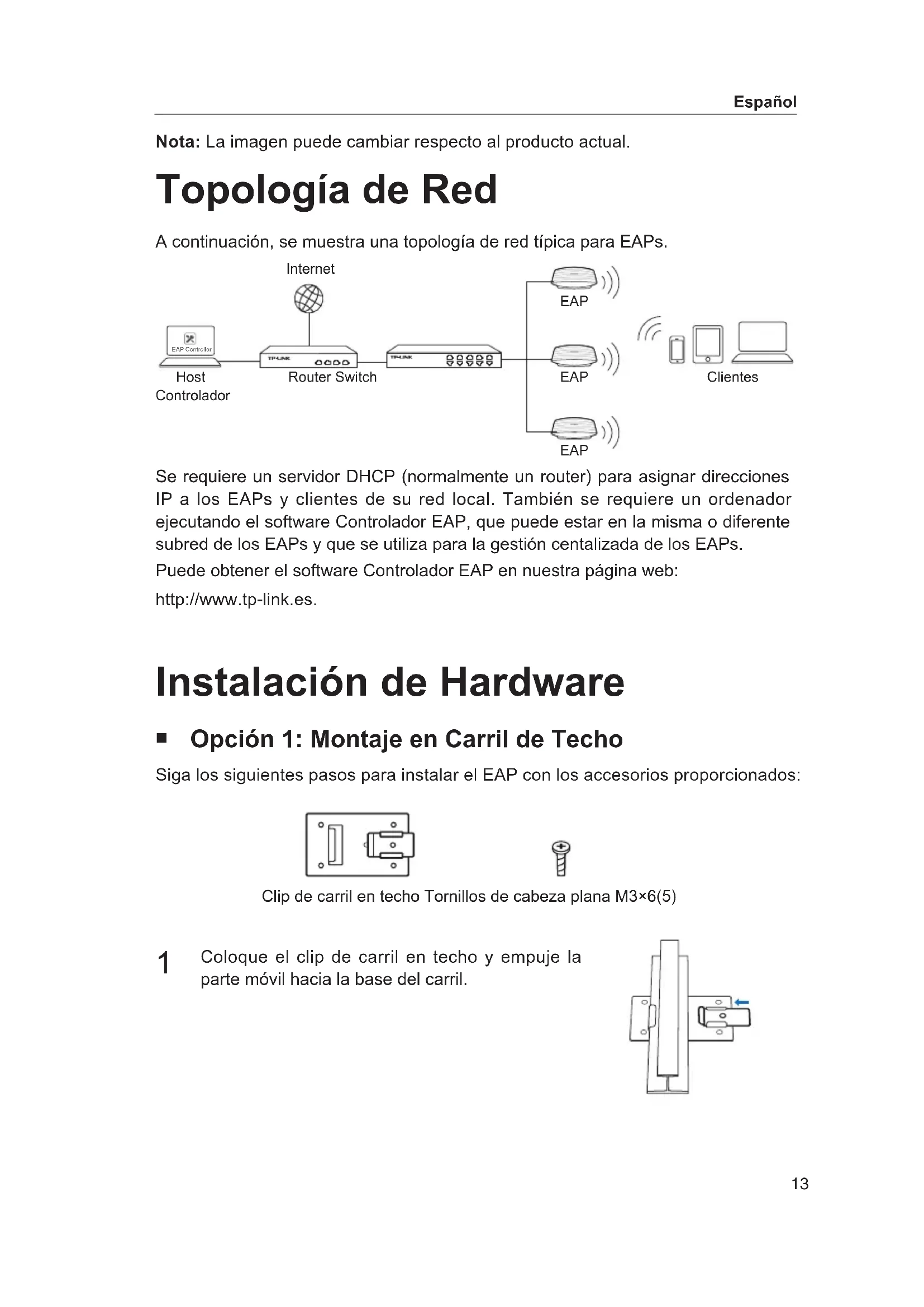 Via Power Adapter Plug one end of the provided power adapter into the POWER port of the EAP and the other end to a standard electrical wall outlet. Switch PoE Switch13 Español Nota: La imagen puede cambiar respecto al producto actual. Topología de Red A continuación, se muestra una topología de red típica para EAPs. EAP Controller Se requiere un servidor DHCP (normalmente un router) para asignar direcciones IP a los EAPs y clientes de su red local. También se requiere un ordenador ejecutando el software Controlador EAP, que puede estar en la misma o diferente subred de los EAPs y que se utiliza para la gestión centalizada de los EAPs. Puede obtener el software Controlador EAP en nuestra página web: http://www.tp-link.es. Instalación de Hardware