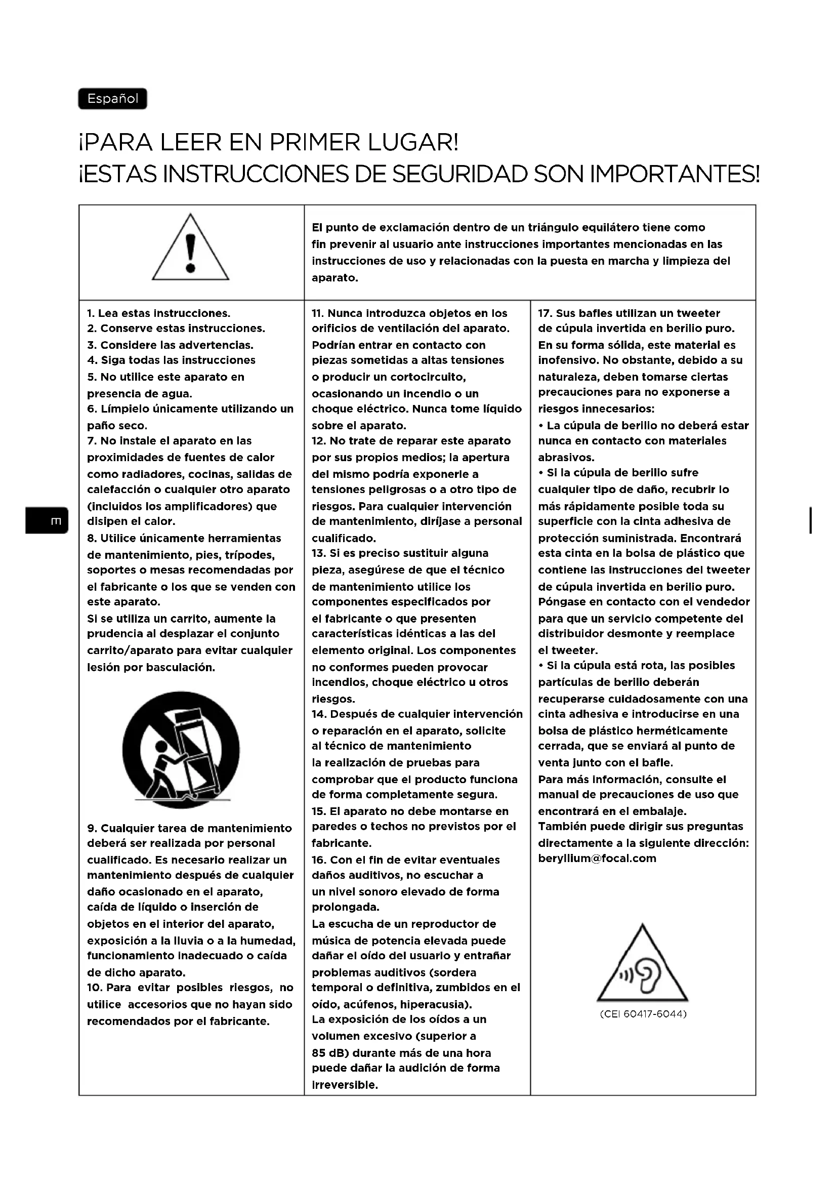 - Si la cúpula está rota, las posibles partículas de berilio deberán recuperarse cuidadosamente con una cinta adhesiva e introducirse en una bolsa de plástico herméticamente cerrada, que se enviará al punto de venta junto con el bafle. Para más información, consulte el manual de precauciones de uso que encontrará en el embalaje. También puede dirigir sus preguntas directamente a la siguiente dirección: beryllium@focal.com (CEI 60417-6044)29 SOPRA
