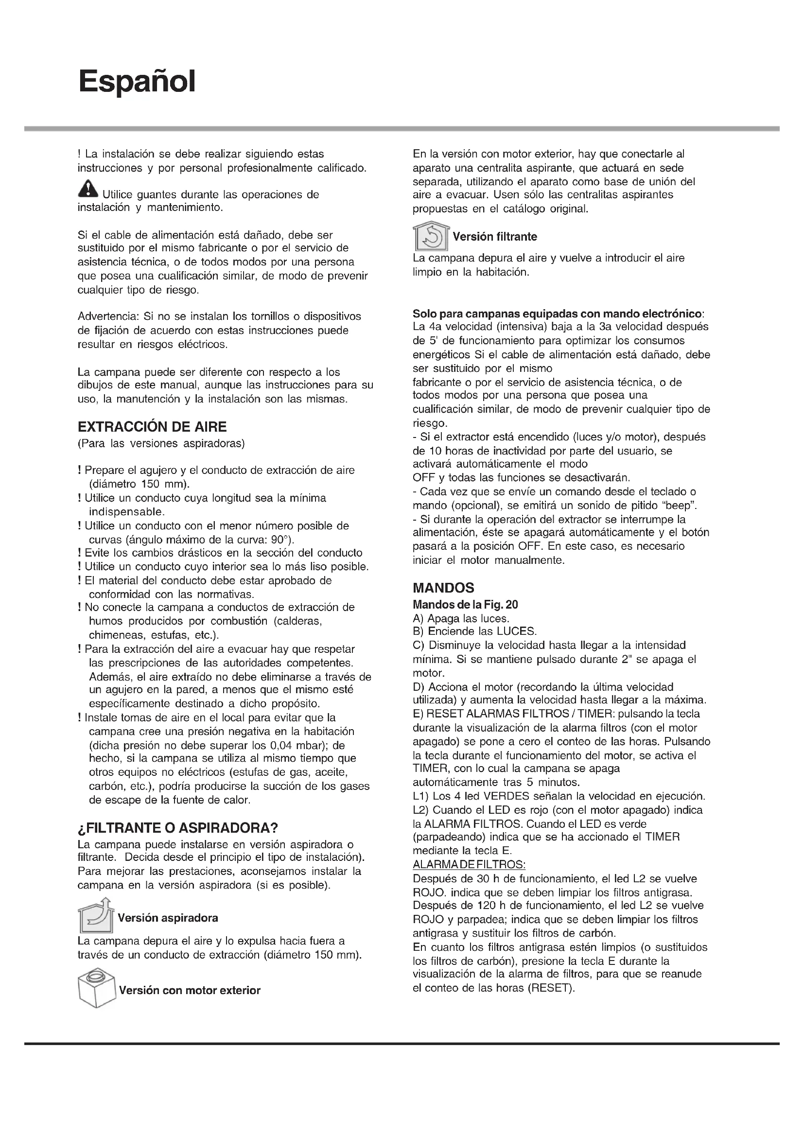 (Para las versiones aspiradoras) ! Prepare el agujero y el conducto de extracción de aire (diámetro 150 mm). ! Utilice un conducto cuya longitud sea la mínima indispensable. ! Utilice un conducto con el menor número posible de curvas (ángulo máximo de la curva: 90°). ! Evite los cambios drásticos en la sección del conducto ! Utilice un conducto cuyo interior sea lo más liso posible. ! El material del conducto debe estar aprobado de conformidad con las normativas. ! No conecte la campana a conductos de extracción de humos producidos por combustión (calderas, chimeneas, estufas, etc.). ! Para la extracción del aire a evacuar hay que respetar las prescripciones de las autoridades competentes. Además, el aire extraído no debe eliminarse a través de un agujero en la pared, a menos que el mismo esté específicamente destinado a dicho propósito. ! Instale tomas de aire en el local para evitar que la campana cree una presión negativa en la habitación (dicha presión no debe superar los 0,04 mbar); de hecho, si la campana se utiliza al mismo tiempo que otros equipos no eléctricos (estufas de gas, aceite, carbón, etc.), podría producirse la succión de los gases de escape de la fuente de calor. ¿FILTRANTE O ASPIRADORA? La campana puede instalarse en versión aspiradora o filtrante. Decida desde el principio el tipo de instalación). Para mejorar las prestaciones, aconsejamos instalar la campana en la versión aspiradora (si es posible). Versión aspiradora La campana depura el aire y lo expulsa hacia fuera a través de un conducto de extracción (diámetro 150 mm). Versión con motor exterior En la versión con motor exterior, hay que conectarle al aparato una centralita aspirante, que actuará en sede separada, utilizando el aparato como base de unión del aire a evacuar. Usen sólo las centralitas aspirantes propuestas en el catálogo original. Versión filtrante La campana depura el aire y vuelve a introducir el aire limpio en la habitación. Solo para campanas equipadas con mando electrónico: La 4a velocidad (intensiva) baja a la 3a velocidad después de 5' de funcionamiento para optimizar los consumos energéticos Si el cable de alimentación está dañado, debe ser sustituido por el mismo fabricante o por el servicio de asistencia técnica, o de todos modos por una persona que posea una cualificación similar, de modo de prevenir cualquier tipo de riesgo. - Si el extractor está encendido (luces y/o motor), después de 10 horas de inactividad por parte del usuario, se activará automáticamente el modo OFF y todas las funciones se desactivarán. - Cada vez que se envíe un comando desde el teclado o mando (opcional), se emitirá un sonido de pitido “beep”. - Si durante la operación del extractor se interrumpe la alimentación, éste se apagará automáticamente y el botón pasará a la posición OFF. En este caso, es necesario iniciar el motor manualmente. MANDOS Mandos de la Fig. 20 A) Apaga las luces. B) Enciende las LUCES. C) Disminuye la velocidad hasta llegar a la intensidad mínima. Si se mantiene pulsado durante 2" se apaga el motor. D) Acciona el motor (recordando la última velocidad utilizada) y aumenta la velocidad hasta llegar a la máxima. E) RESET ALARMAS FILTROS / TIMER: pulsando la tecla durante la visualización de la alarma filtros (con el motor apagado) se pone a cero el conteo de las horas. Pulsando la tecla durante el funcionamiento del motor, se activa el TIMER, con lo cual la campana se apaga automáticamente tras 5 minutos. L1) Los 4 led VERDES señalan la velocidad en ejecución. L2) Cuando el LED es rojo (con el motor apagado) indica la ALARMA FILTROS. Cuando el LED es verde (parpadeando) indica que se ha accionado el TIMER mediante la tecla E. ALARMA DE FILTROS: Después de 30 h de funcionamiento, el led L2 se vuelve ROJO. indica que se deben limpiar los filtros antigrasa. Después de 120 h de funcionamiento, el led L2 se vuelve ROJO y parpadea; indica que se deben limpiar los filtros antigrasa y sustituir los filtros de carbón. En cuanto los filtros antigrasa estén limpios (o sustituidos los filtros de carbón), presione la tecla E durante la visualización de la alarma de filtros, para que se reanude el conteo de las horas (RESET).Mandos de la Fig. 21 Botón A = interruptor encendido luz. Botón B = interruptor encendido ON/OFF motor en la Ia velocidad. Botón C = interruptor II velocidad.Botón D = interruptor III velocidad. Mandos de la Fig. 22 P1: Enciende i apaga las LUCES P2: Arranca el motor en primera velocidad (el testigo permanece iluminado). Testigos de velocidades restantes permanecen apagados. P3: Arranca el motor en segunda velocidad (el testigo permanece iluminado). Testigos de velocidades restantes permanecen apagados. P4: Arranca el motor en tercera velocidad (el testigo permanece iluminado). Testigos de velocidades restantes permanecen apagados. P5: Arranca el motor en cuarta velocidad (el testigo parpadea). Testigos de velocidades restantes permanecen apagados. La velocidad máxima ha sido programada para un tiempo máximo de 5 minutos, después de este tiempo se pone de forma automática la tercera velocidad. P6: Establece el TIMER (el testigo permanece iluminado). Estableciendo el Timer (5 minutos), el motor se para de forma automática después de 5 minutos. P7: ALARMA DE FILTROS. Después de 30 horas de trabajo el testigo se ilumina, para avisar de la necesidad de limpieza de los filtros. Después de 120 horas de trabajo el testigo se ilumina, para avisar de la necesidad de la limpieza del filtro de las grasas y cambiar los filtros de carbón. Para RESETEAR la alarma, se debe pulsar el testigo mientras está iluminado (o cuando esta intermitente). Mandos de la Fig. 23-24 Botón TC1 (Luces): Enciende / apaga las luces ON/OFFSi la luz principal está encendida, el led BL1 cambia de color y se enciende. Al mantener pulsado el botón, se encienden / apagan las luces auxiliares (opcionales). Botón TC2 (Motor – V