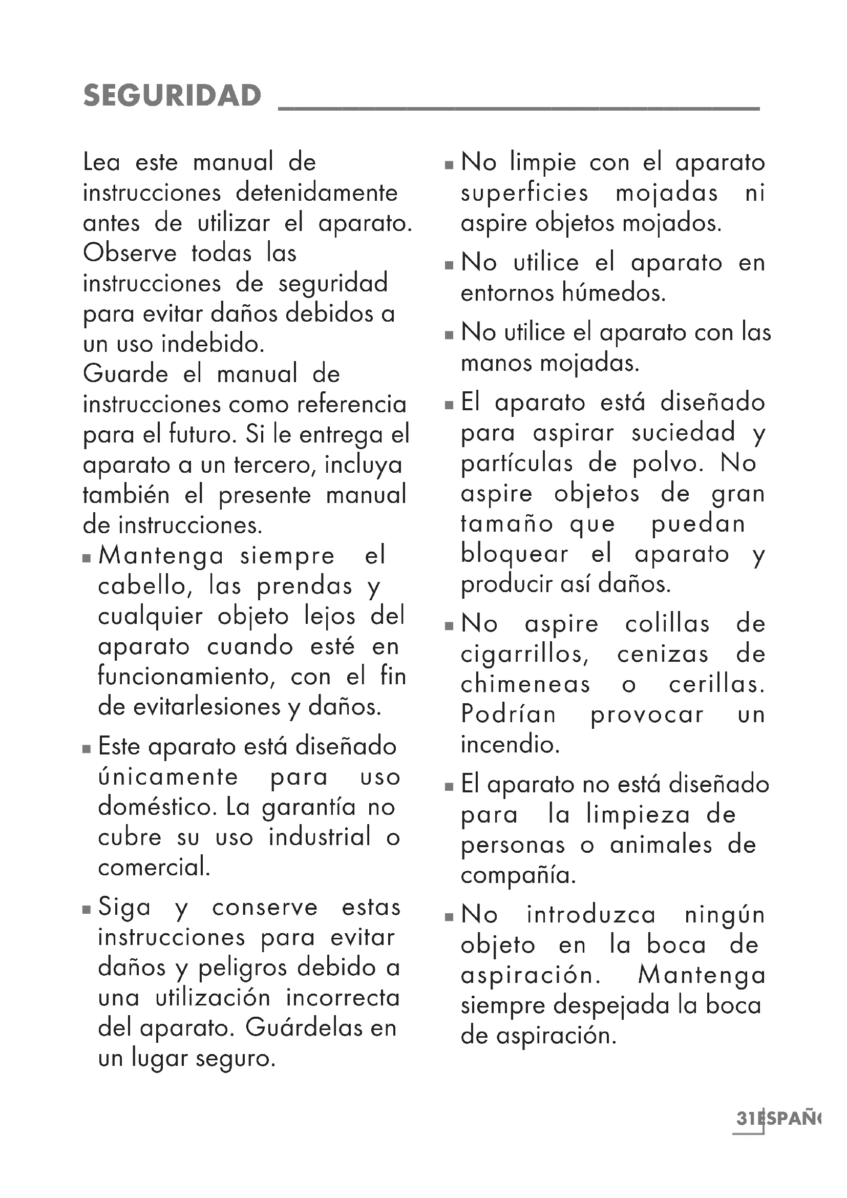 El aspirador es muy potente; por lo tanto, antes de enchu- farlo a la toma de corriente de la pared, asegúrese de que esté en posición de apa- gado. Sujete firmemente el aspirador antes de empezar a usarlo y mientras lo use.34 ESPAÑOL SEGURIDAD ______________________________