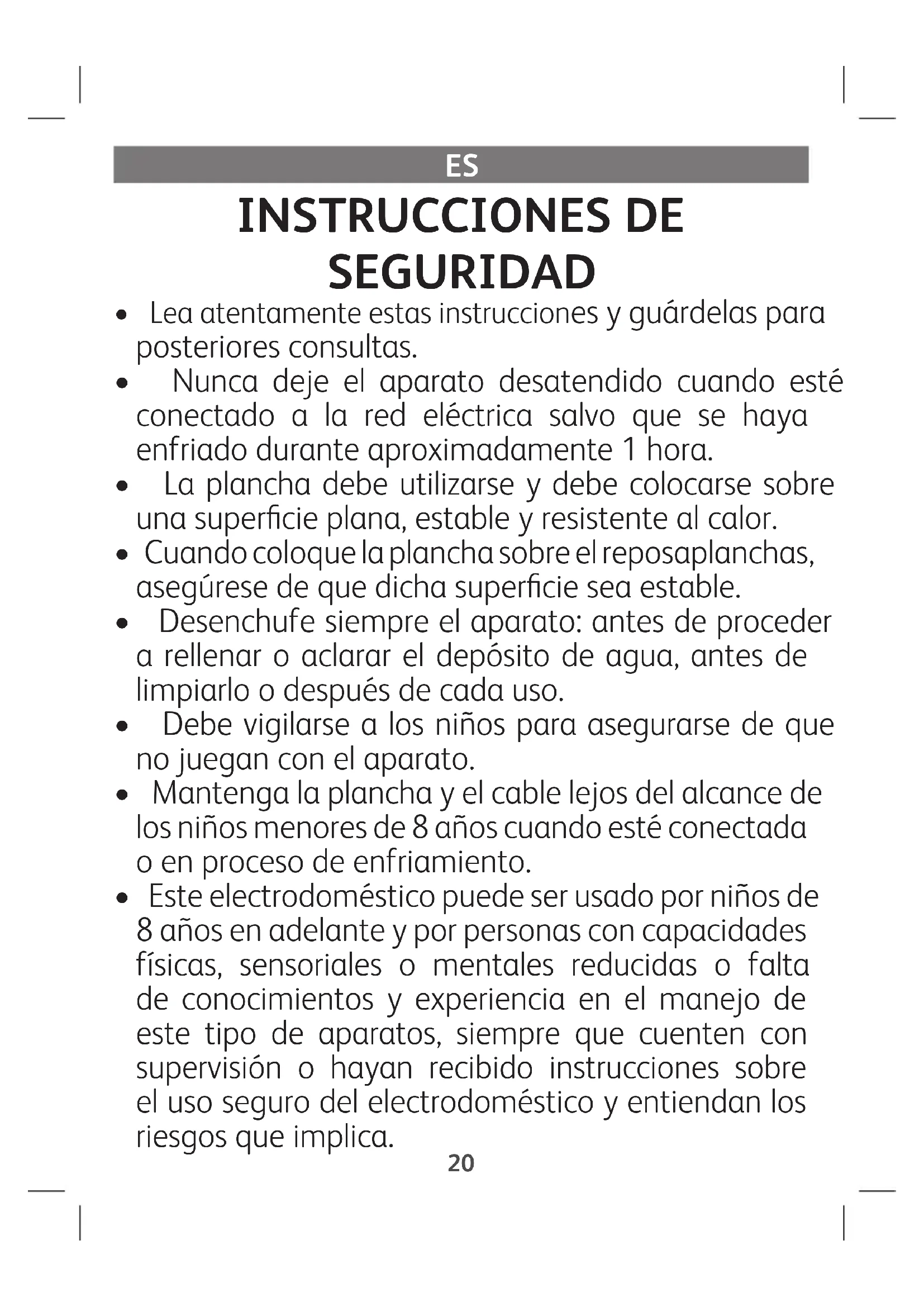 - Mantenga la plancha y el cable lejos del alcance de los niños menores de 8 años cuando esté conectada o en proceso de enfriamiento.