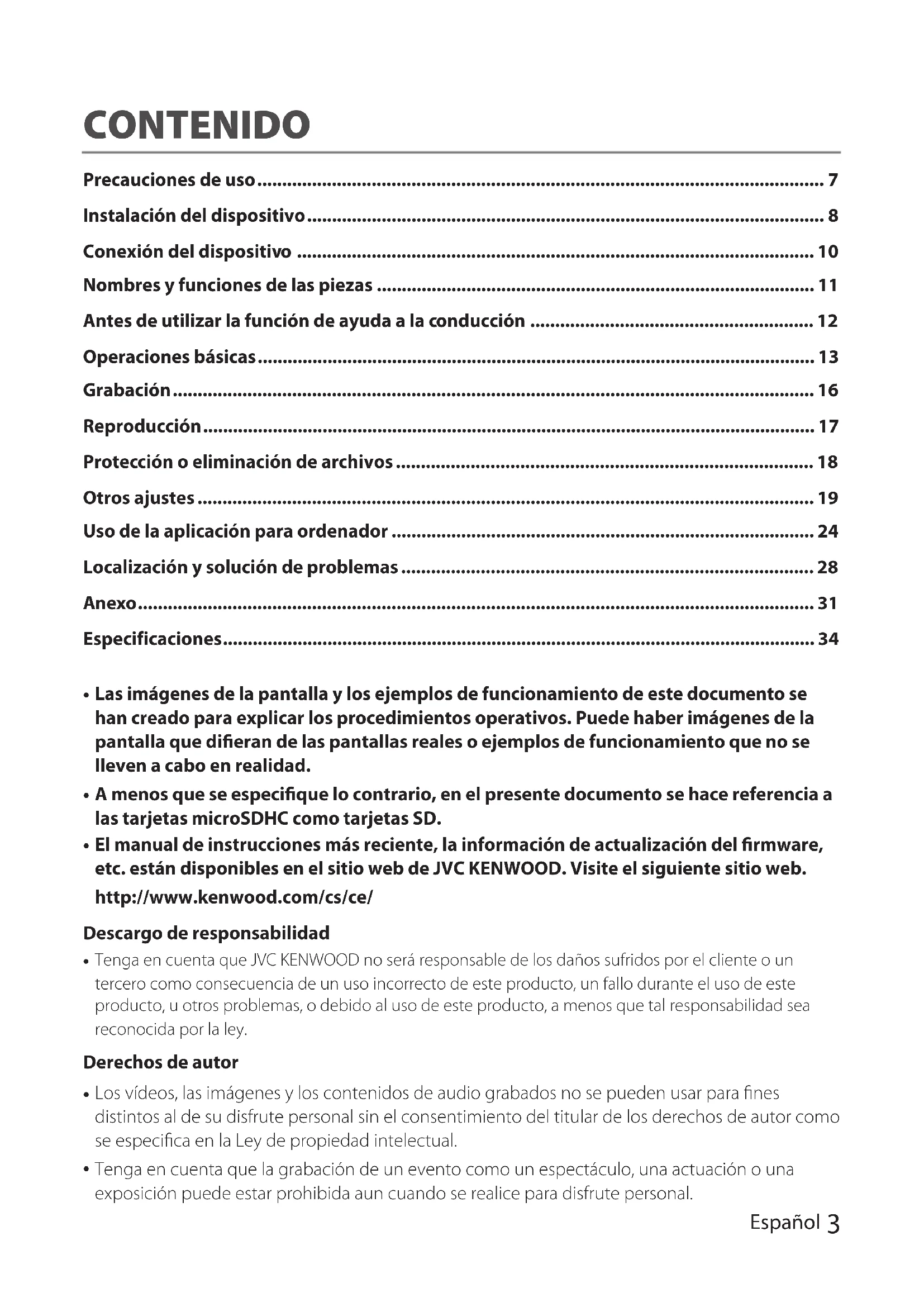 Cumpla las normas de tráco para garantizar una conducción segura, prestando atención a la distancia con el vehículo que circula delante, su entorno y las condiciones de conducción y frenando cuando sea necesario. Además, su funcionamiento no está totalmente garantizado incluso aunque se utilice correctamente el dispositivo como se describe en el manual de instrucciones. Tenga en cuenta que JVC KENWOOD no asume ninguna responsabilidad por las pérdidas sufridas en consecuencia.