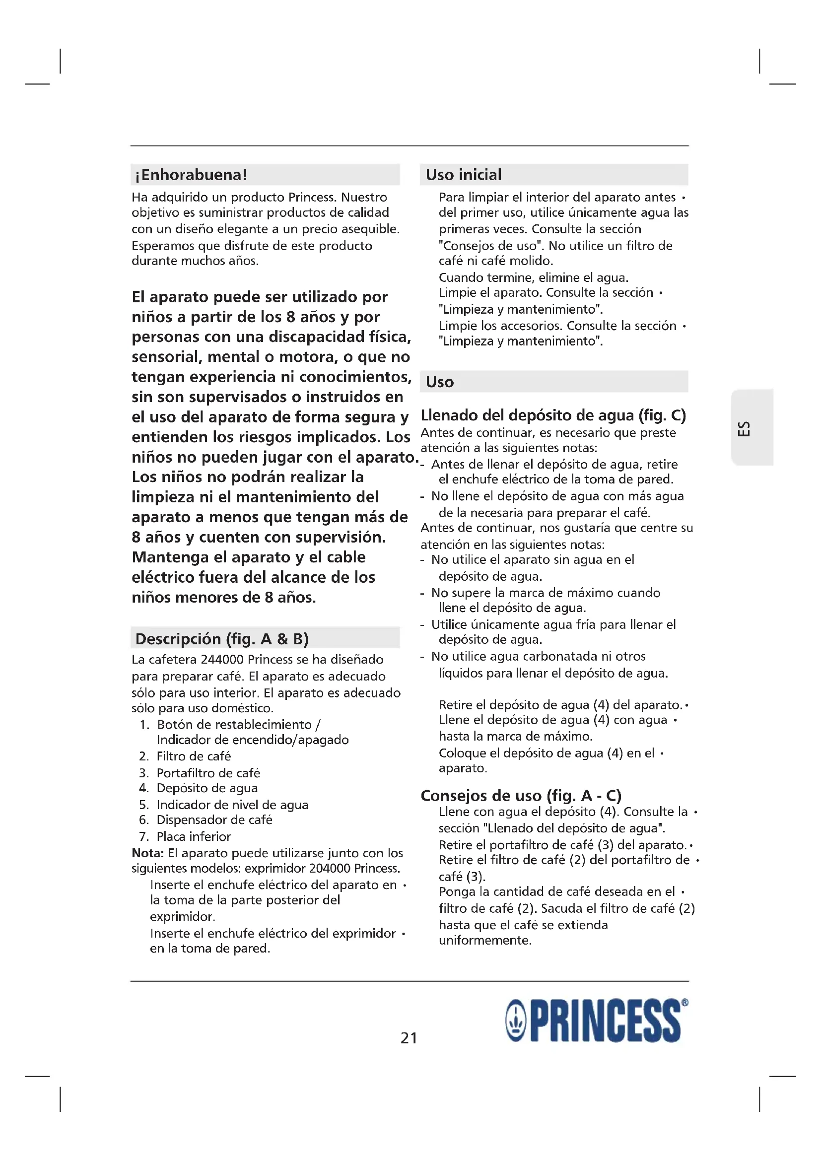 ¡Enhorabuena! Ha adquirido un producto Princess. Nuestro objetivo es suministrar productos de calidad con un diseño elegante a un precio asequible. Esperamos que disfrute de este producto durante muchos años. El aparato puede ser utilizado por niños a partir de los 8 años y por personas con una discapacidad física, sensorial, mental o motora, o que no tengan experiencia ni conocimientos, sin son supervisados o instruidos en el uso del aparato de forma segura y entienden los riesgos implicados. Los niños no pueden jugar con el aparato. Los niños no podrán realizar la limpieza ni el mantenimiento del aparato a menos que tengan más de 8 años y cuenten con supervisión. Mantenga el aparato y el cable eléctrico fuera del alcance de los niños menores de 8 años. Descripción (fig. A & B) La cafetera 244000 Princess se ha diseñado para preparar café. El aparato es adecuado sólo para uso interior. El aparato es adecuado sólo para uso doméstico.