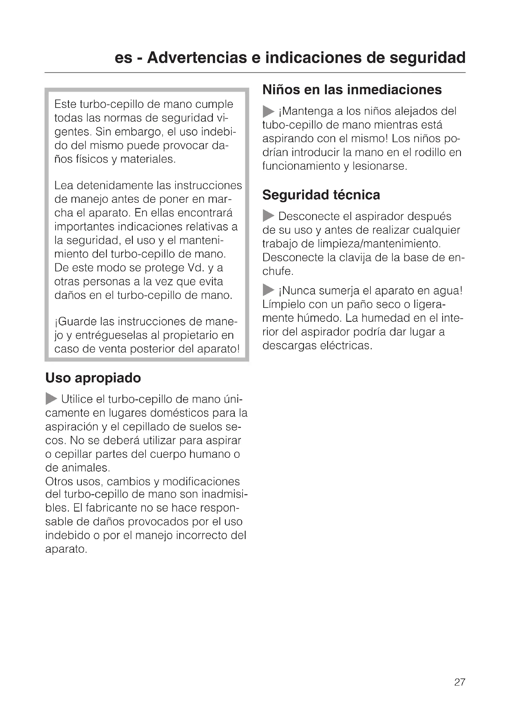 ¡Nunca sumerja el aparato en agua! Límpielo con un paño seco o ligera- mente húmedo. La humedad en el inte- rior del aspirador podría dar lugar a descargas eléctricas. es - Advertencias e indicaciones de seguridad 27Uso apropiado