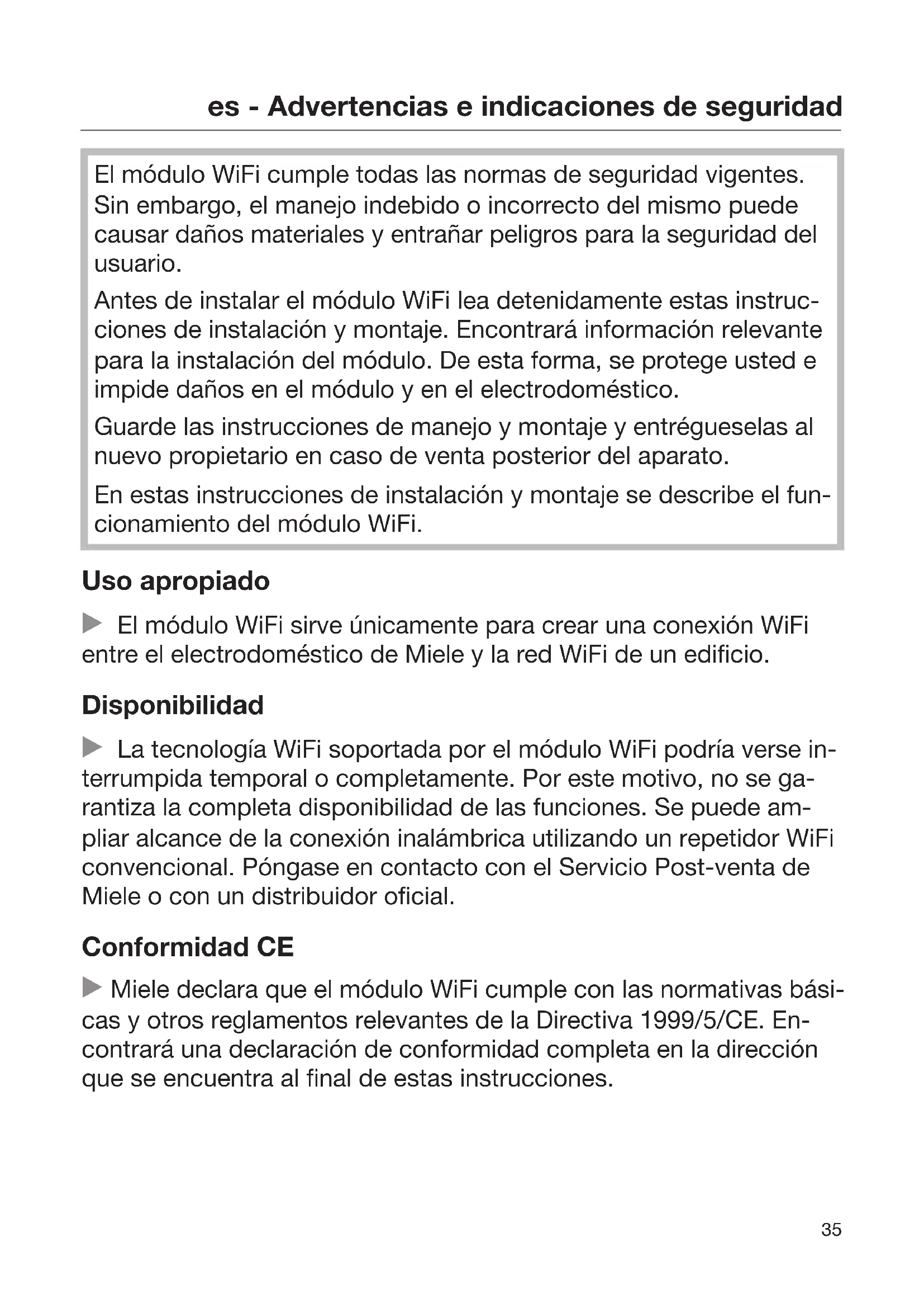 El módulo WiFi cumple todas las normas de seguridad vigentes. Sin embargo, el manejo indebido o incorrecto del mismo puede causar daños materiales y entrañar peligros para la seguridad del usuario. Antes de instalar el módulo WiFi lea detenidamente estas instruc- ciones de instalación y montaje. Encontrará información relevante para la instalación del módulo. De esta forma, se protege usted e impide daños en el módulo y en el electrodoméstico. Guarde las instrucciones de manejo y montaje y entrégueselas al nuevo propietario en caso de venta posterior del aparato. En estas instrucciones de instalación y montaje se describe el fun- cionamiento del módulo WiFi. Uso apropiado El módulo WiFi sirve únicamente para crear una conexión WiFi entre el electrodoméstico de Miele y la red WiFi de un edificio. Disponibilidad La tecnología WiFi soportada por el módulo WiFi podría verse in- terrumpida temporal o completamente. Por este motivo, no se ga- rantiza la completa disponibilidad de las funciones. Se puede am- pliar alcance de la conexión inalámbrica utilizando un repetidor WiFi convencional. Póngase en contacto con el Servicio Post-venta de Miele o con un distribuidor oficial. Conformidad CE Miele declara que el módulo WiFi cumple con las normativas bási- cas y otros reglamentos relevantes de la Directiva 1999/5/CE. En- contrará una declaración de conformidad completa en la dirección que se encuentra al final de estas instrucciones.es - Advertencias e indicaciones de seguridad