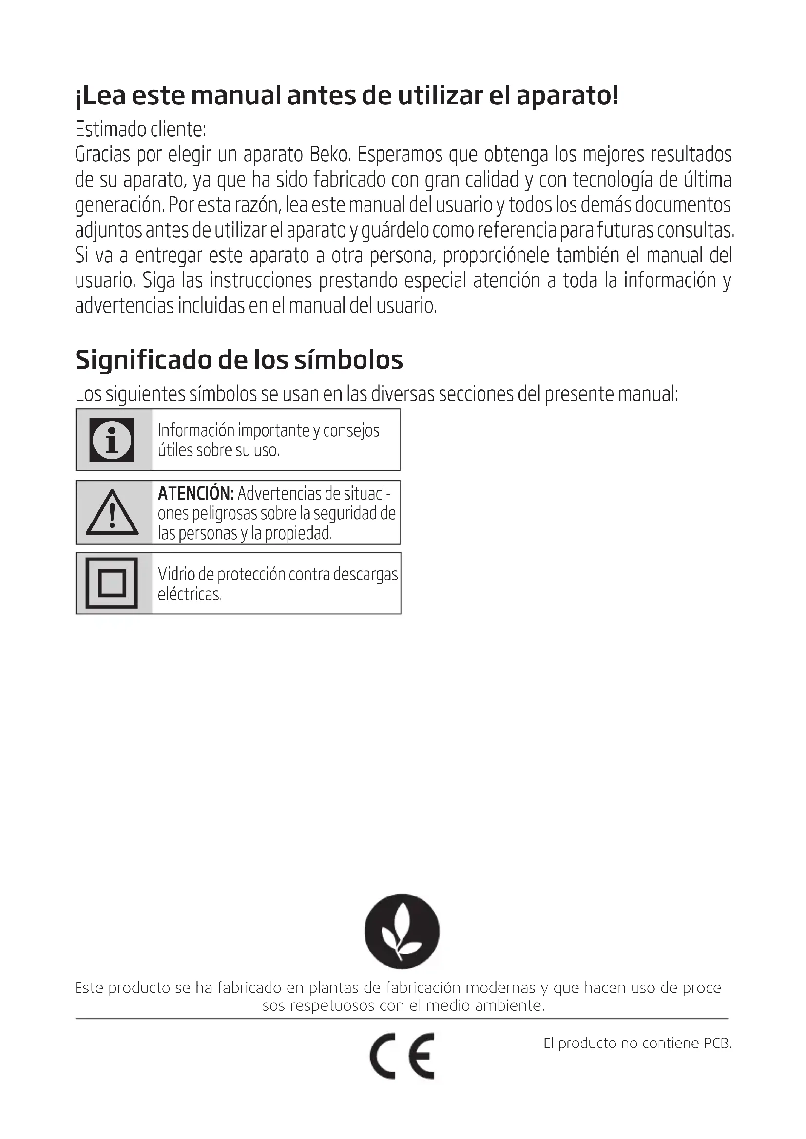 ATENCIÓN: Advertencias de situaci- ones peligrosas sobre la seguridad de las personas y la propiedad. Vidrio de protección contra descargas eléctricas. Este producto se ha fabricado en plantas de fabricación modernas y que hacen uso de proce-sos respetuosos con el medio ambiente.El producto no contiene PCB.Aspirador / Manual del usuario 103 / ES Esta sección contiene instrucciones de seguridad que ayudarán a la protección contra los riesgos de lesiones personales o daño a la propiedad. El incumplimiento de estas instrucciones puede causar la pérdida de la garantía.