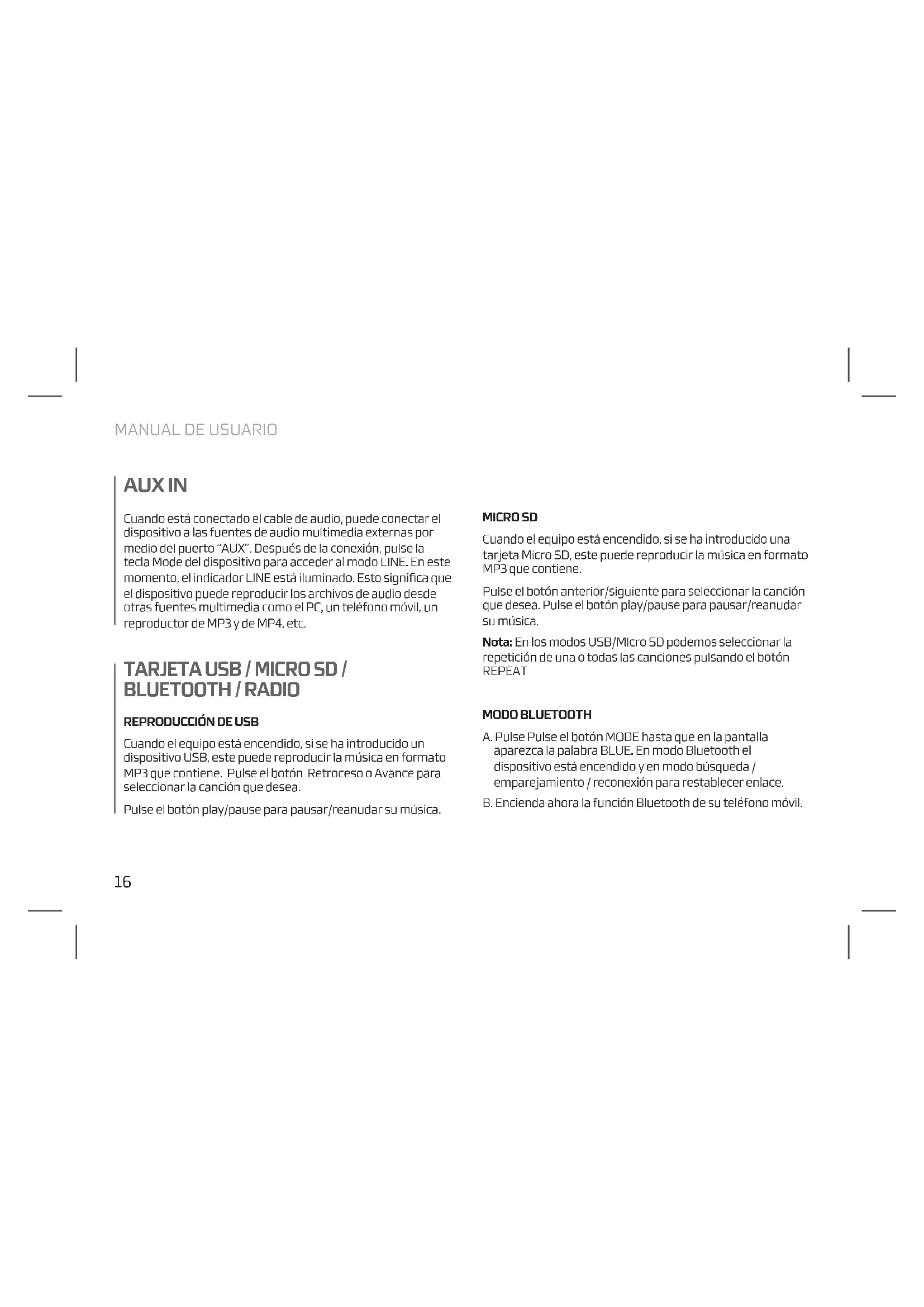 Cuando el equipo está encendido, si se ha introducido un dispositivo USB, este puede reproducir la música en formato MP3 que contiene. Pulse el botón Retroceso o Avance para seleccionar la canción que desea. Pulse el botón play/pause para pausar/reanudar su música. MICRO SD Cuando el equipo está encendido, si se ha introducido una tarjeta Micro SD, este puede reproducir la música en formato MP3 que contiene. Pulse el botón anterior/siguiente para seleccionar la canción que desea. Pulse el botón play/pause para pausar/reanudar su música. Nota: En los modos USB/MIcro SD podemos seleccionar la repetición de una o todas las canciones pulsando el botón REPEAT MODO BLUETOOTH A. Pulse Pulse el botón MODE hasta que en la pantalla aparezca la palabra BLUE. En modo Bluetooth el dispositivo está encendido y en modo búsqueda / emparejamiento / reconexión para restablecer enlace. B. Encienda ahora la función Bluetooth de su teléfono móvil. AUX IN Cuando está conectado el cable de audio, puede conectar el dispositivo a las fuentes de audio multimedia externas por medio del puerto “AUX”. Después de la conexión, pulse la tecla Mode del dispositivo para acceder al modo LINE. En este momento, el indicador LINE está iluminado. Esto significa que el dispositivo puede reproducir los archivos de audio desde otras fuentes multimedia como el PC, un teléfono móvil, un reproductor de MP3 y de MP4, etc.ESPAÑOL