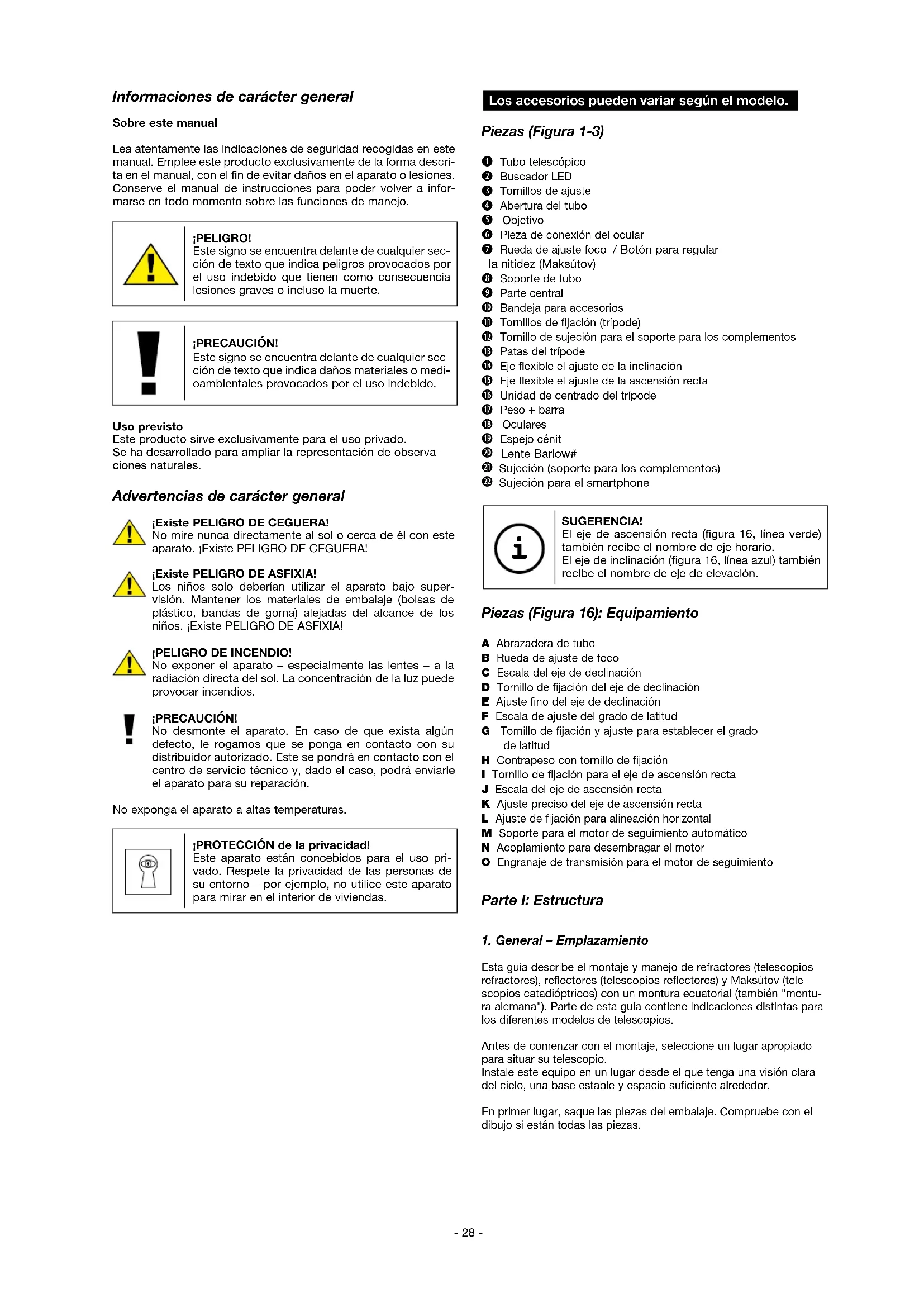 Esta guía describe el montaje y manejo de refractores (telescopios refractores), reflectores (telescopios reflectores) y Maksútov (tele- scopios catadióptricos) con un montura ecuatorial (también "montu- ra alemana"). Parte de esta guía contiene indicaciones distintas para los diferentes modelos de telescopios. Antes de comenzar con el montaje, seleccione un lugar apropiado para situar su telescopio. Instale este equipo en un lugar desde el que tenga una visión clara del cielo, una base estable y espacio suficiente alrededor. En primer lugar, saque las piezas del embalaje. Compruebe con el dibujo si están todas las piezas.- 29 -
