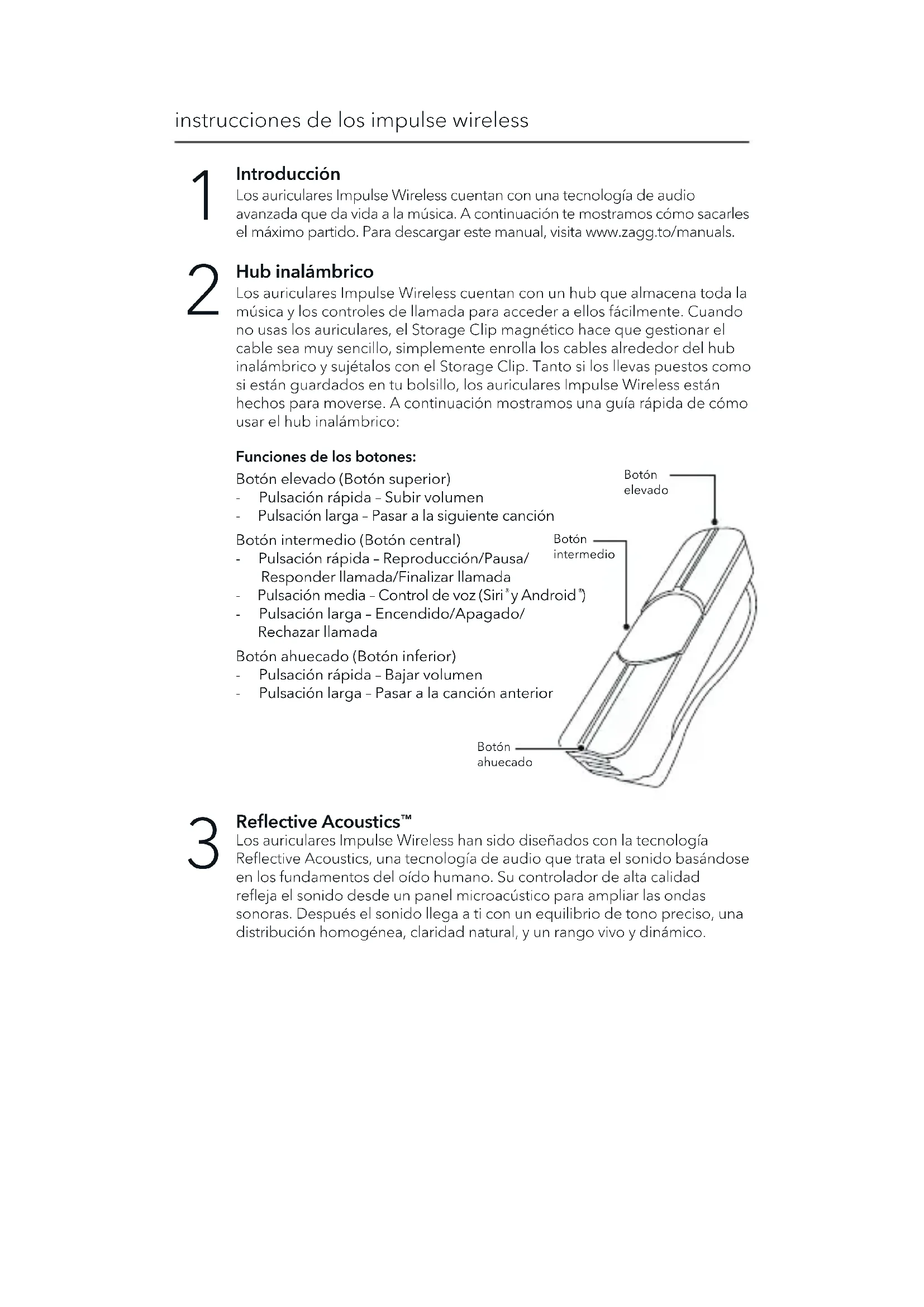 Los auriculares Impulse Wireless han sido diseñados con la tecnología Reflective Acoustics, una tecnología de audio que trata el sonido basándose en los fundamentos del oído humano. Su controlador de alta calidad refleja el sonido desde un panel microacústico para ampliar las ondas sonoras. Después el sonido llega a ti con un equilibrio de tono preciso, una distribución homogénea, claridad natural, y un rango vivo y dinámico. Hub inalámbrico Los auriculares Impulse Wireless cuentan con un hub que almacena toda la música y los controles de llamada para acceder a ellos fácilmente. Cuando no usas los auriculares, el Storage Clip magnético hace que gestionar el cable sea muy sencillo, simplemente enrolla los cables alrededor del hub inalámbrico y sujétalos con el Storage Clip. Tanto si los llevas puestos como si están guardados en tu bolsillo, los auriculares Impulse Wireless están hechos para moverse. A continuación mostramos una guía rápida de cómo usar el hub inalámbrico: Funciones de los botones: Botón elevado (Botón superior) - Pulsación rápida – Subir volumen - Pulsación larga – Pasar a la siguiente canción Botón intermedio (Botón central) - Pulsación rápida – Reproducción/Pausa/ Responder llamada/Finalizar llamada - Pulsación media – Control de voz (Siri
