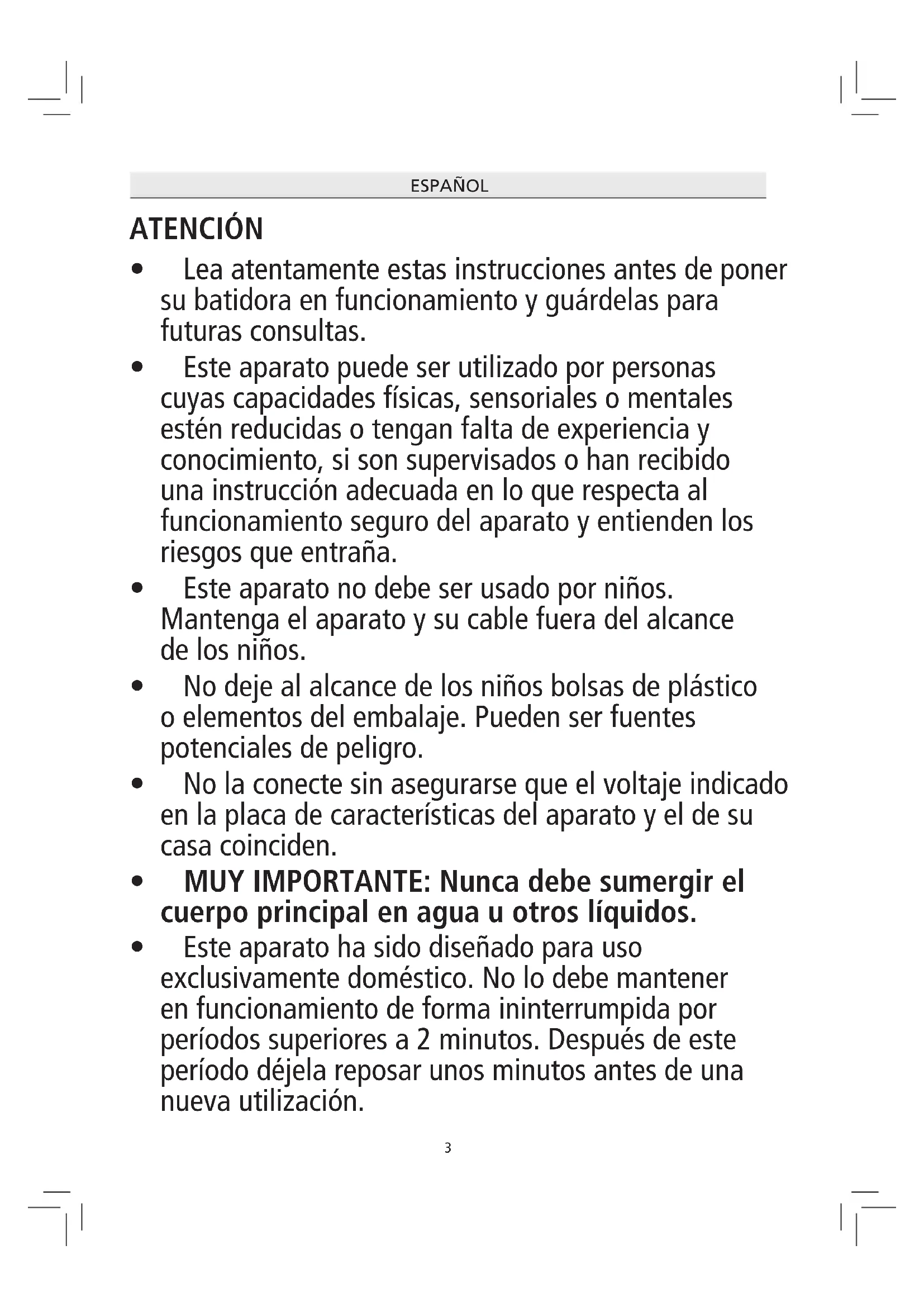 - Este aparato ha sido diseñado para uso exclusivamente doméstico. No lo debe mantener en funcionamiento de forma ininterrumpida por períodos superiores a 2 minutos. Después de este período déjela reposar unos minutos antes de una nueva utilización.4