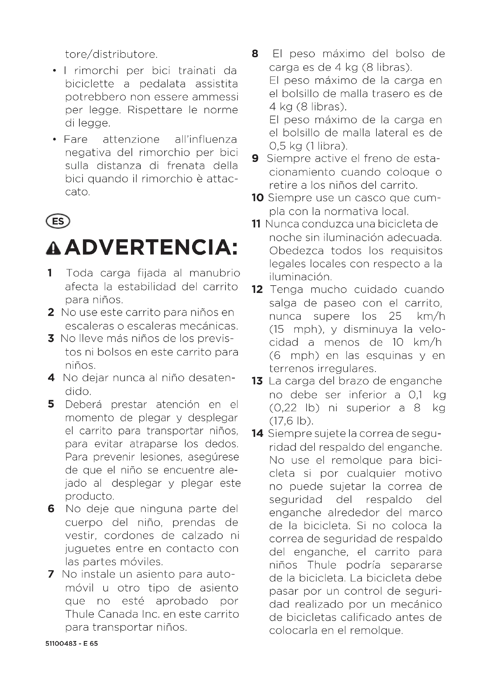 Deberá prestar atención en el momento de plegar y desplegar el carrito para transportar niños, para evitar atraparse los dedos. Para prevenir lesiones, asegúrese de que el niño se encuentre ale- jado al desplegar y plegar este producto. 6 No deje que ninguna parte del cuerpo del niño, prendas de vestir, cordones de calzado ni juguetes entre en contacto con las partes móviles. 7 No instale un asiento para auto- móvil u otro tipo de asiento que no esté aprobado por ThuleCanadaInc. en este carrito para transportar niños. 8 El peso máximo del bolso de carga es de 4kg (8libras). El peso máximo de la carga en el bolsillo de malla trasero es de 4kg (8libras). El peso máximo de la carga en el bolsillo de malla lateral es de 0,5kg (1libra). 9 Siempre active el freno de esta- cionamiento cuando coloque o retire a los niños del carrito. 10 Siempre use un casco que cum- pla con la normativa local. 11 Nunca conduzca una bicicleta de noche sin iluminación adecuada. Obedezca todos los requisitos legales locales con respecto a la iluminación. 12 Tenga mucho cuidado cuando salga de paseo con el carrito, nunca supere los 25 km/h (15 mph), y disminuya la velo- cidad a menos de 10 km/h (6 mph) en las esquinas y en terrenos irregulares. 13 La carga del brazo de enganche no debe ser inferior a 0,1 kg (0,22 lb) ni superior a 8 kg (17,6lb). 14 Siempre sujete la correa de segu- ridad del respaldo del enganche. No use el remolque para bici- cleta si por cualquier motivo no puede sujetar la correa de seguridad del respaldo del enganche alrededor del marco de la bicicleta. Si no coloca la correa de seguridad de respaldo del enganche, el carrito para niños Thule podría separarse de la bicicleta. La bicicleta debe pasar por un control de seguri- dad realizado por un mecánico de bicicletas calificado antes de colocarla en el remolque.51100483 - E66 15 Este carrito se volverá inestable si se supera el peso recomen- dado por el fabricante. No lo use con niños que superen los límites de peso. 16 Asegúrese de que todos los dispositivos de seguridad estén conectados antes de usar el carrito. 17 Antes de iniciar un recorrido, asegúrese de que ambas rue- das estén colocadas de manera segura en el eje del carrito. 18 Este remolque no está indicado para niños menores de 6meses, a menos que se use con un accesorio para bebés de Thule aprobado. a. Los niños deben tener al menos 6meses ypoder sen- tarse sin ayuda. b. Para andar en bicicleta, el niño debe ser lo suficientemente grande como para usar casco y sentarse derecho sin ayuda. Consulte con el pediatra si el niño tiene menos de un año. 19 Evite las lesiones graves por caídas o deslizamiento del niño. Use siempre el cinturón de segu- ridad. 20 Cuando use este carrito para niños con un solo niño, este debe estar sentado del lado derecho. 21 El usuario de este carrito para transportar niños debe tener en cuenta los peligros a los que se exponen a los niños, como enfriamiento por el viento y agotamiento térmico, tanto si se trata de niños menos activos en exposiciones prolongadas a temperaturas bajas, como por períodos prolongados a tempe- raturas altas sin la ventilación o la hidratación adecuadas. 22 Cuando este carrito para niños se use como remolque para bici- cleta, la cubierta para el clima debe cerrarse para evitar que entren residuos o escombros en el carrito. 23 Debe haber un reflector que cumpla con la normativa local visible en la parte trasera de este carrito para niños cuando se utilice con una bicicleta. 24 Antes de cada paseo, asegúrese de que el carrito para niños acoplado no interfiera con los frenos, los pedales ni el manu- brio de la bicicleta. 25 El uso del remolque cambia la estabilidad, los requisitos de frenado y las características de paseo de su bicicleta. 26 Cuando gire a la derecha, el ángulo entre la bicicleta que remolca y el carrito para niños Thule no debe superar los 45°. 27 Cuando gire a la izquierda, el ángulo no debe superar los 90°. 28 Siempre use indicadores de seguridad. 29 La perilla de liberación rápida se debe ajustar por completo en la traba antirrobo de liberación rápida con al menos dos hilos de rosca más allá del final de la perilla de liberación rápida para asegurar que la rueda tra- sera de la bicicleta no se afloje. Siempre asegúrese de que la liberación rápida esté colocada correctamente. Una liberación rápida tensionada de manera incorrecta podría hacer que la rueda trasera se afloje acciden-51100483 - E 67 talmente. 30 La tuerca en el eje trasero debe ajustarse en al menos 5 vueltas completas para asegurar una fuerza de sujeción adecuada. Puede desechar la arandela ori- ginal en algunos ejes para hacer espacio para el ezHitch. Consulte con su vendedor de bicicletas para estar seguro. Según el tipo de cubo, la arandela de apoyo de par existente para el cubo debe mantenerse en el marco. Siga las instrucciones de armado para el cubo y las especificaciones de par delfabricante para ajustar la tuerca del eje.