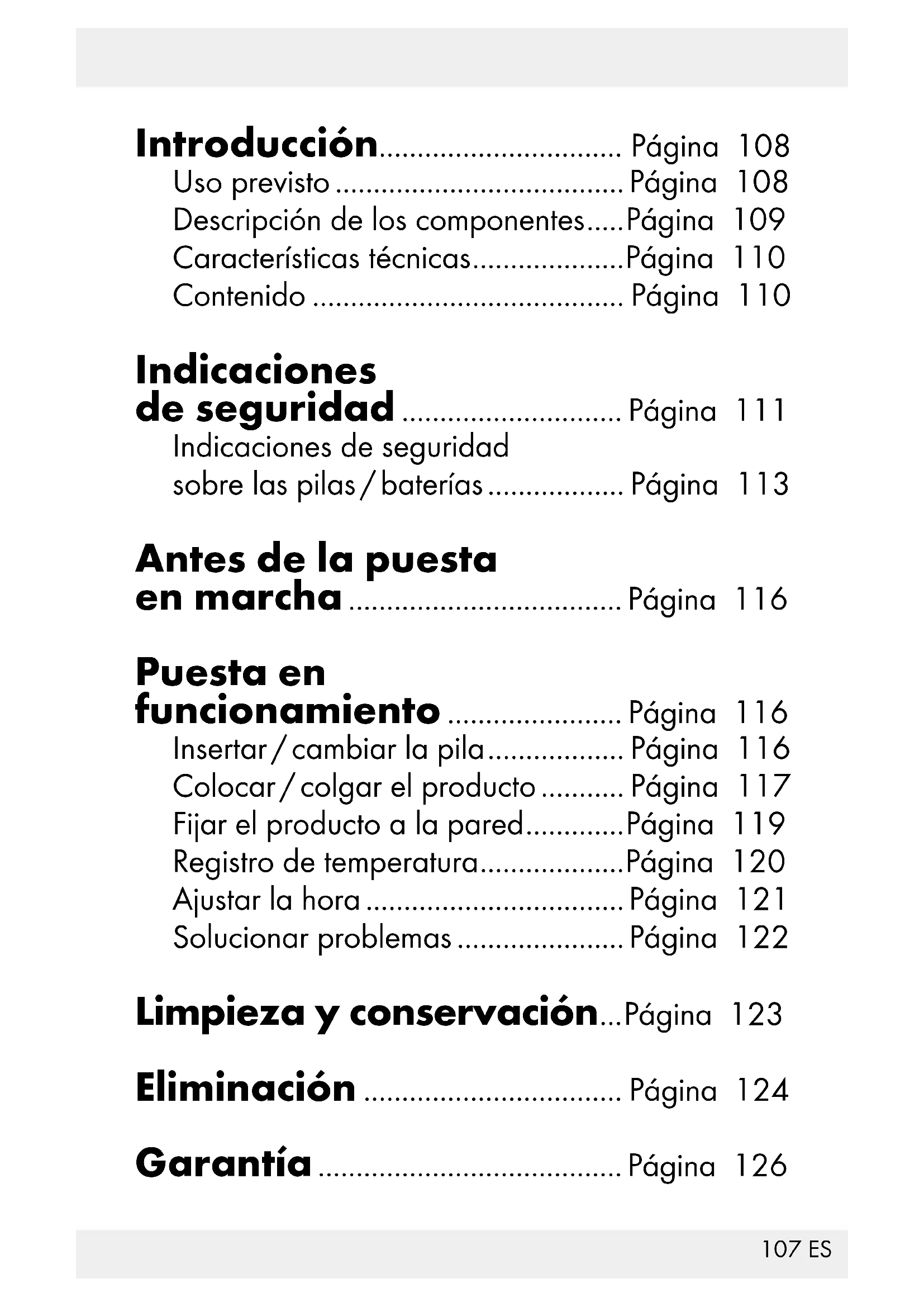 Solucionar problemas Nota: El producto contiene componentes electrónicos sensibles. Por ello podría sufrir interferencias por otros equipos de radio- transmisión que se encuentren en las proximi- dades.123 ES Si aparecen indicaciones de error en la pantalla, retire los aparatos de este tipo del entorno del producto. Nota: Las descargas electrostáticas pueden provocar perturbaciones en el funcionamiento. Si se producen tales fallos, retire la pila brevemente y colóquela de nuevo de acuerdo a lo explicado en el capítulo „Insertar/cambiar la pila“. Limpieza y conservación No utilice en ningún caso productos de limpieza abrasivos o corrosivos. Si lo hace puede dañarse la superficie del producto. Para la limpieza, utilice un paño ligera- mente humedecido y sin pelusas.124 ES Eliminación El embalaje está compuesto por materiales no contaminantes que pueden ser desechados en el cen- tro de reciclaje local. El punto verde no se aplica en Alemania.