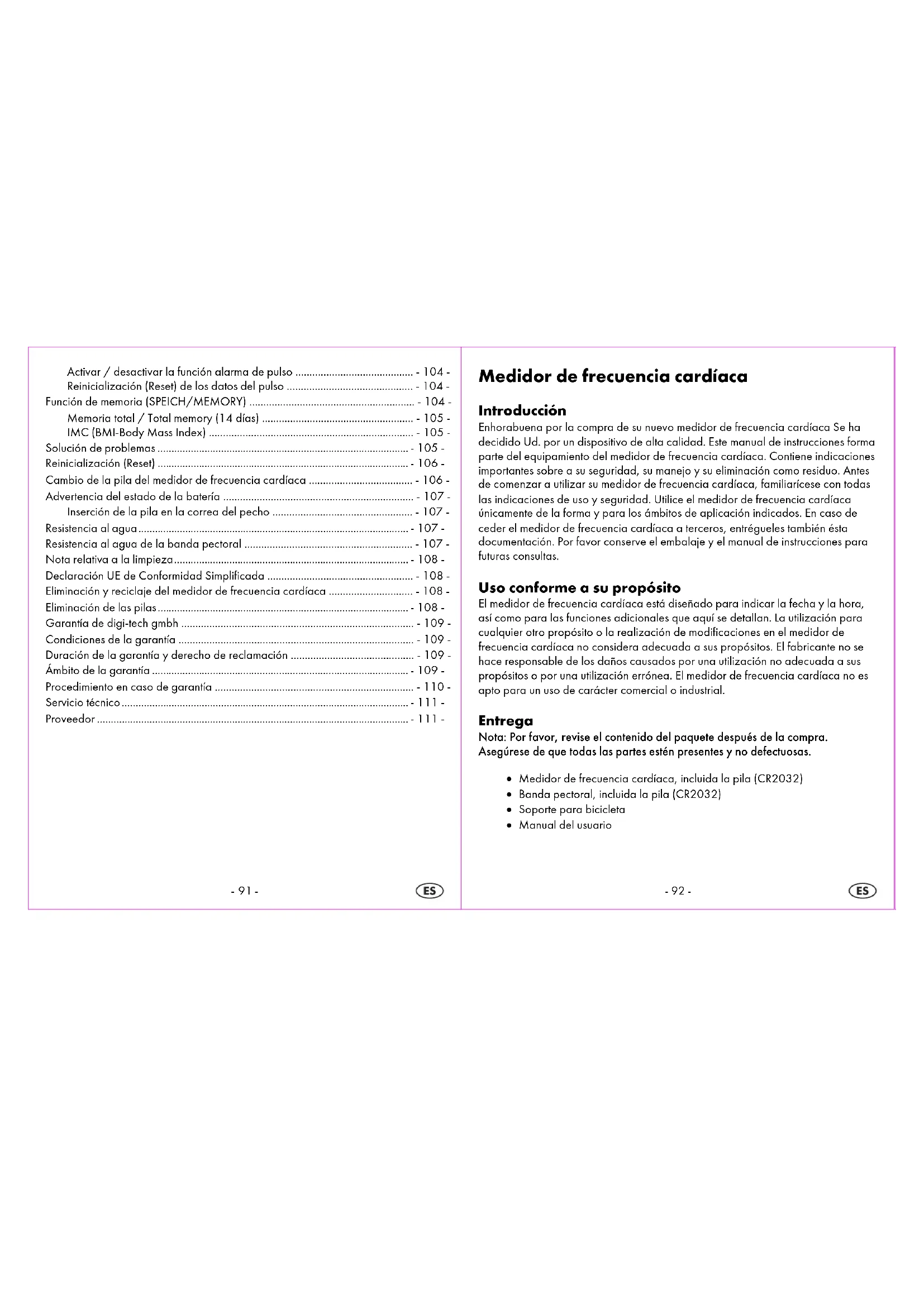 Medidor de frecuencia cardíaca Introducción Enhorabuena por la compra de su nuevo medidor de frecuencia cardíaca Se ha decidido Ud. por un dispositivo de alta calidad. Este manual de instrucciones forma parte del equipamiento del medidor de frecuencia cardíaca. Contiene indicaciones importantes sobre a su seguridad, su manejo y su eliminación como residuo. Antes de comenzar a utilizar su medidor de frecuencia cardíaca, familiarícese con todas las indicaciones de uso y seguridad. Utilice el medidor de frecuencia cardíaca únicamente de la forma y para los ámbitos de aplicación indicados. En caso de ceder el medidor de frecuencia cardíaca a terceros, entrégueles también ésta documentación. Por favor conserve el embalaje y el manual de instrucciones para futuras consultas. Uso conforme a su propósito El medidor de frecuencia cardíaca está diseñado para indicar la fecha y la hora, así como para las funciones adicionales que aquí se detallan. La utilización para cualquier otro propósito o la realización de modificaciones en el medidor de frecuencia cardíaca no considera adecuada a sus propósitos. El fabricante no se hace responsable de los daños causados por una utilización no adecuada a sus propósitos o por una utilización errónea. El medidor de frecuencia cardíaca no es apto para un uso de carácter comercial o industrial. Entrega Nota: Por favor, revise el contenido del paquete después de la compra. Asegúrese de que todas las partes estén presentes y no defectuosas. Medidor de frecuencia cardíaca, incluida la pila (CR2032) Banda pectoral, incluida la pila (CR2032) Soporte para bicicleta Manual del usuario-