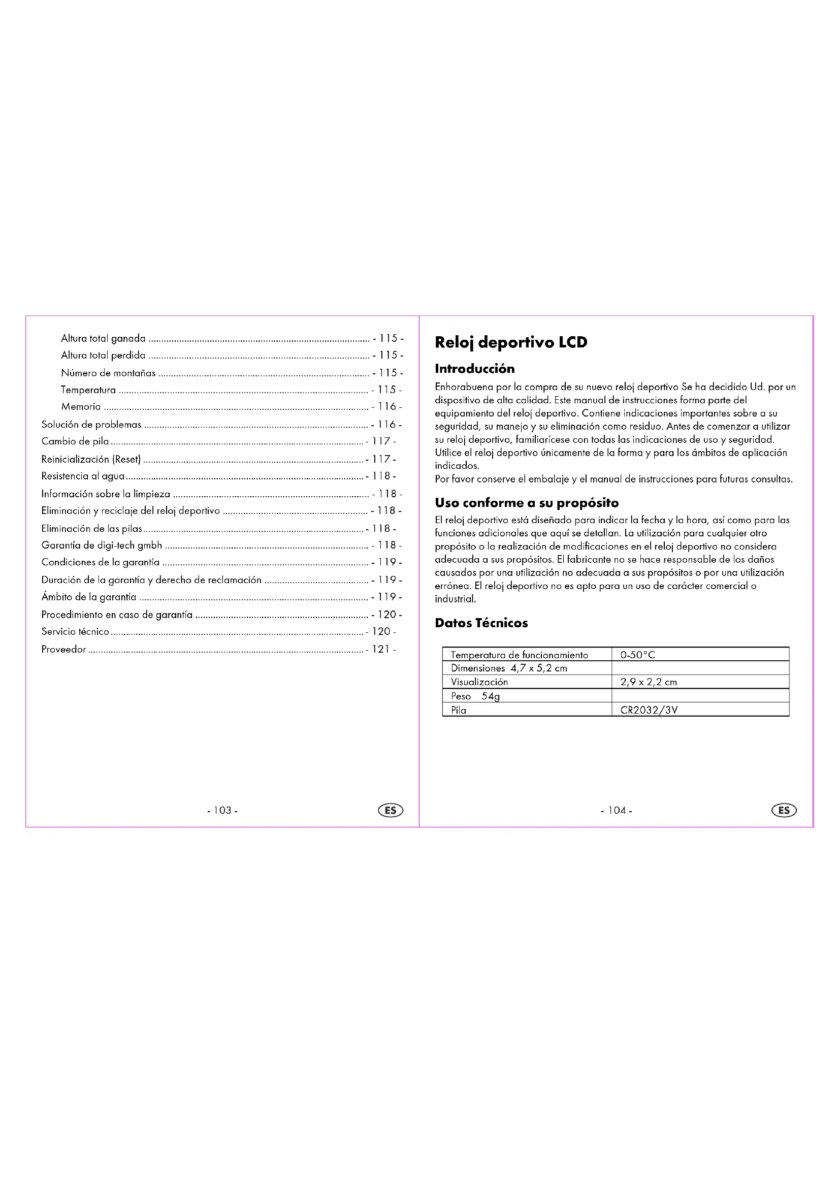 Información sobre la limpieza Limpie el reloj deportivo únicamente con un paño seco y sin pelusas, como por ej. para la limpieza de gafas. Eliminación y reciclaje del reloj deportivo Este reloj deportivo no debe eliminarse con los residuos domésticos. Deseche el reloj deportivo utilizando un servicio de reciclaje autorizado o el punto verde de su municipio. En caso de duda, consulte a su punto de reciclaje. Eliminación de las pilas Por favor, deseche las pilas correctamente, en los contenedores especiales de pilas dispuestos en tiendas de comercio. Las pilas no deben tirarse a la basura de casa. Deseche las pilas a través de un servicio de eliminación de residuos autorizados o a través de sus instalaciones locales de eliminación. Toman nota de las normas actualmente en vigor. En caso de duda, póngase en contacto con su centro de eliminación de residuos. Garantía de digi-tech gmbh Con estereloj deportivorecibe Ud. una garantía con una validez de 3 años a partir de la fecha de la compra. En caso de defectos de estereloj deportivole corresponden a Ud. derechos legalmente reconocidos frente al vendedor. Estos derechos legalmente reconocidos no se ven limitados por la garantía que se expone a continuación.-