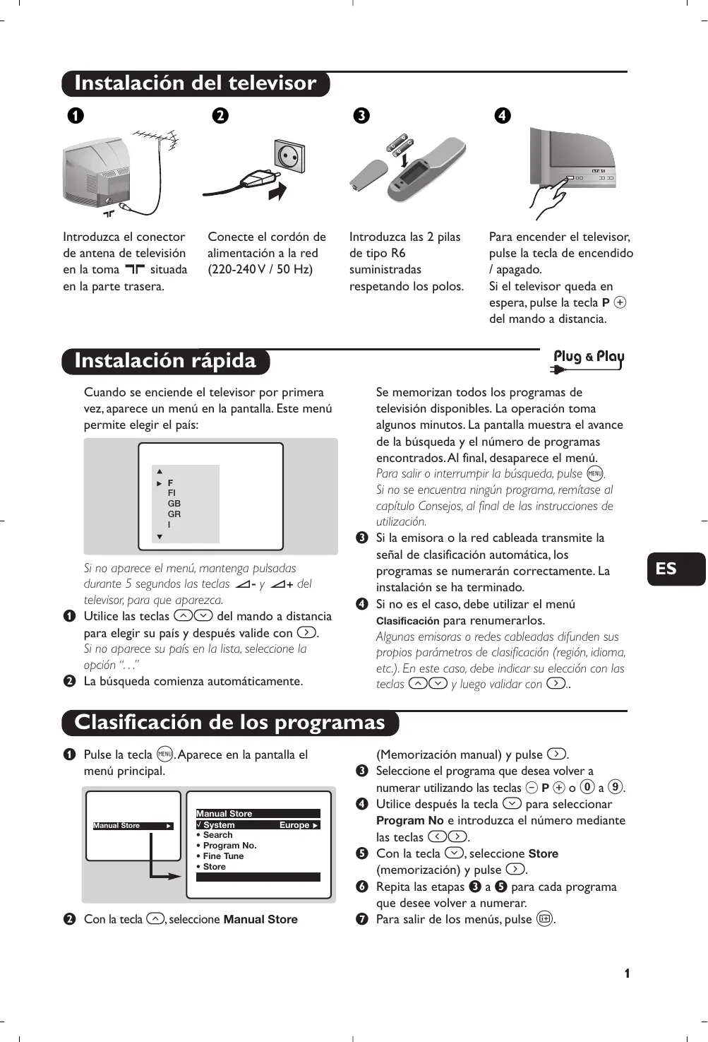 Introduzca el conector de antena de televisión en la toma : situada en la parte trasera. Conecte el cordón de alimentación a la red (220-240 V / 50 Hz) Introduzca las 2 pilas de tipo R6 suministradas respetando los polos. Para encender el televisor, pulse la tecla de encendido / apagado. Si el televisor queda en espera, pulse la tecla P # del mando a distancia. Instalación rápida Cuando se enciende el televisor por primera vez, aparece un menú en la pantalla. Este menú permite elegir el país: Si no aparece el menú, mantenga pulsadas durante 5 segundos las teclas ”- y ”+ del televisor, para que aparezca. & Utilice las teclas îÏ del mando a distancia para elegir su país y después valide con ¬. Si no aparece su país en la lista, seleccione la opción “. . .” é La búsqueda comienza automáticamente. Se memorizan todos los programas de televisión disponibles. La operación toma algunos minutos. La pantalla muestra el avance de la búsqueda y el número de programas encontrados.Al final, desaparece el menú. Para salir o interrumpir la búsqueda, pulse H. Si no se encuentra ningún programa, remítase al capítulo Consejos, al final de las instrucciones de utilización. “ Si la emisora o la red cableada transmite la señal de clasificación automática, los programas se numerarán correctamente. La instalación se ha terminado. ‘ Si no es el caso, debe utilizar el menú Clasificación para renumerarlos. Algunas emisoras o redes cableadas difunden sus propios parámetros de clasificación (región, idioma, etc.). En este caso, debe indicar su elección con las teclas îÏ y luego validar con ¬.. Clasificación de los programas & Pulse la tecla H.Aparece en la pantalla el menú principal. Manual Store